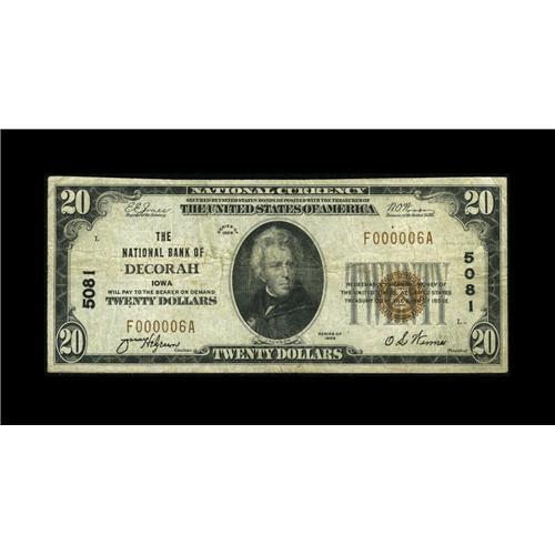 <B>Decorah, IA</B></I> - $20 1929 Ty. 1 <B>The NB of Decorah</B></I> Ch. # 5081<BR>This example bears low single digit serial number 6 and is one of only five surviving examples from the 183 sheets printed. <B>Fine.</B></I>