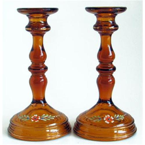 This lovely pair of amber color Depression glass candlesticks have hand painted floral decoration on their bases and lots of gold trim. They each measure 8" tall and are both in excellent condition.