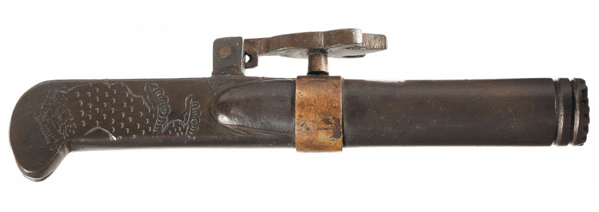 The hand cannon has a pill lock and a brass band that acts as a safety. There are two grooves at the muzzle and a star design on the face of the muzzle. The grip is bird head shaped and is decorated with simple designs in the metal. OAL: 6 inches. Provenance: The William Ashby Collection