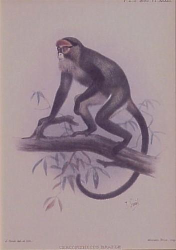 Decorative 19th Century Monkey Print CERCOPITHECUS BRAZZAE, TREE MONKEY, color lithograph designed by J. Smith, signature in the stone and inscribed “P. Z. S. 1893 plate XXXIII, sheet 7 1/4 x 5 1/4", published Mintern Bros, ornately framed (with glass).