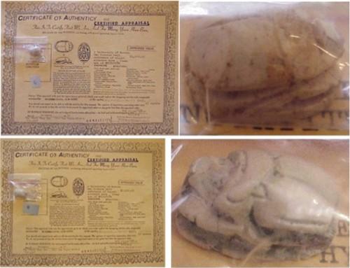 ROYAL EGYPTIAN SCARABS, a pair of hand-carved Enstatite gemstone Scarabs, each approximately 3/8 x ½ x ¼” in size, all with certificates from The Pearl Shop, Las Vegas. (2) STARTING BID $20. ESTIMATE $20 TO $1000