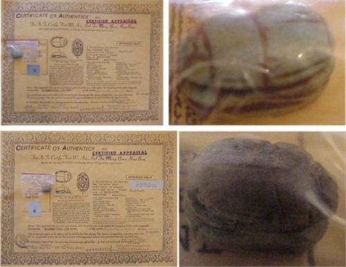 ROYAL EGYPTIAN SCARABS, a pair of hand-carved Enstatite gemstone Scarabs, each approximately 3/8 x ½ x ¼” in size, all with certificates from The Pearl Shop, Las Vegas. (2) STARTING BID $20. ESTIMATE $20 TO $1000