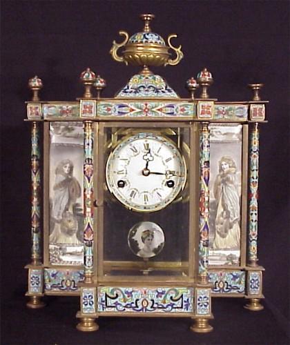 Decorative Arts: French Style Chinese cloisonné Mantle clock Pendulum Clock in glass and cloisonné brass case, flanked with French figural plaques, with portraiture pendulum, 17 1/2" high, stamped Tian Jin Peoples Republic of China, lacking two small cloisonné crowns, enamel in good condition, wind-up key included.