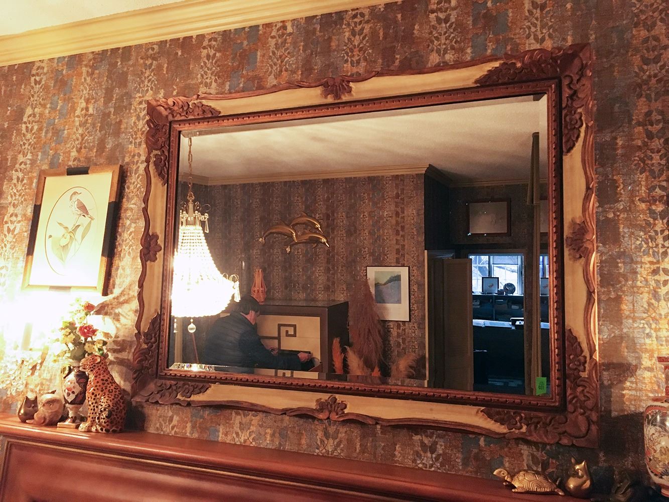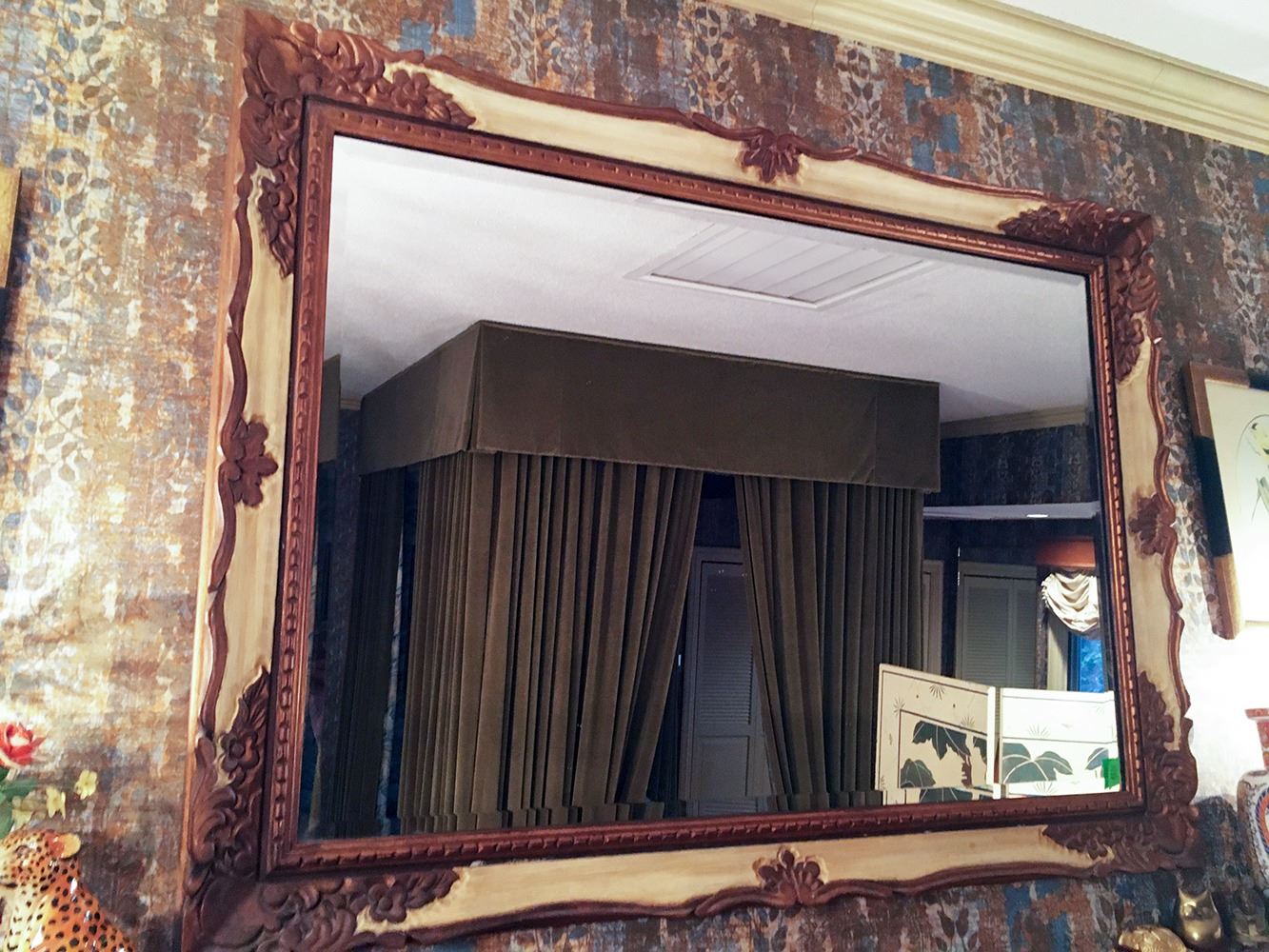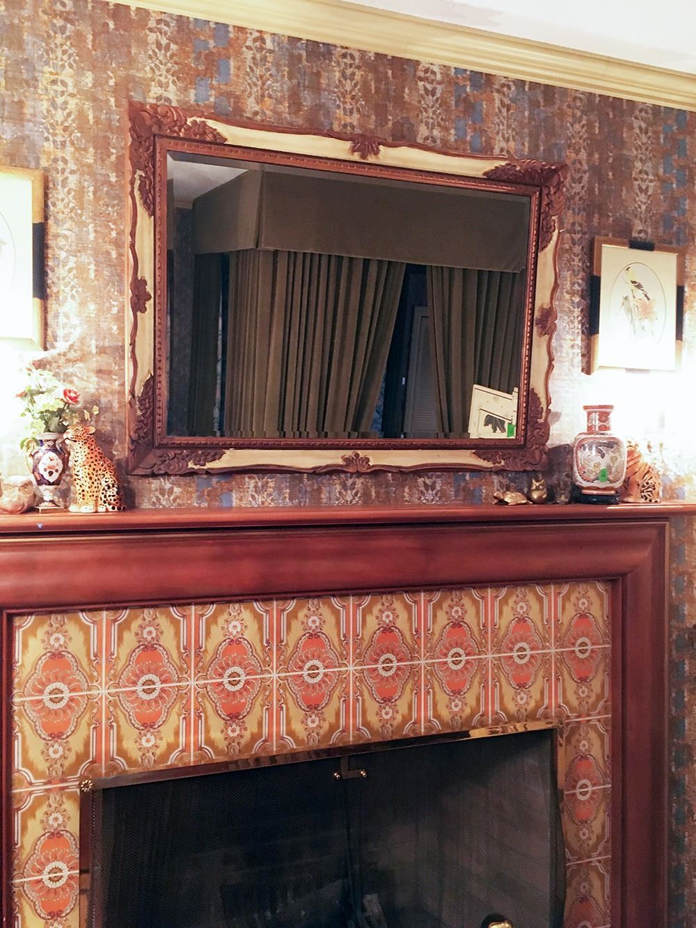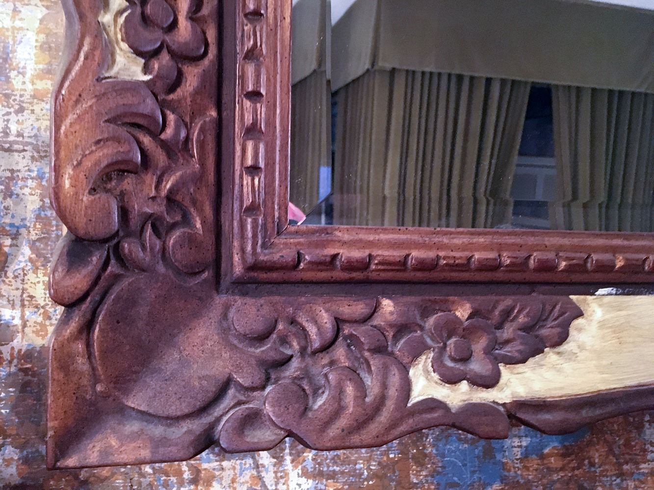 Decorative wooden bevelled mirro over the mantel, measures approx. 32 inches tall x 44 inches wide. pd