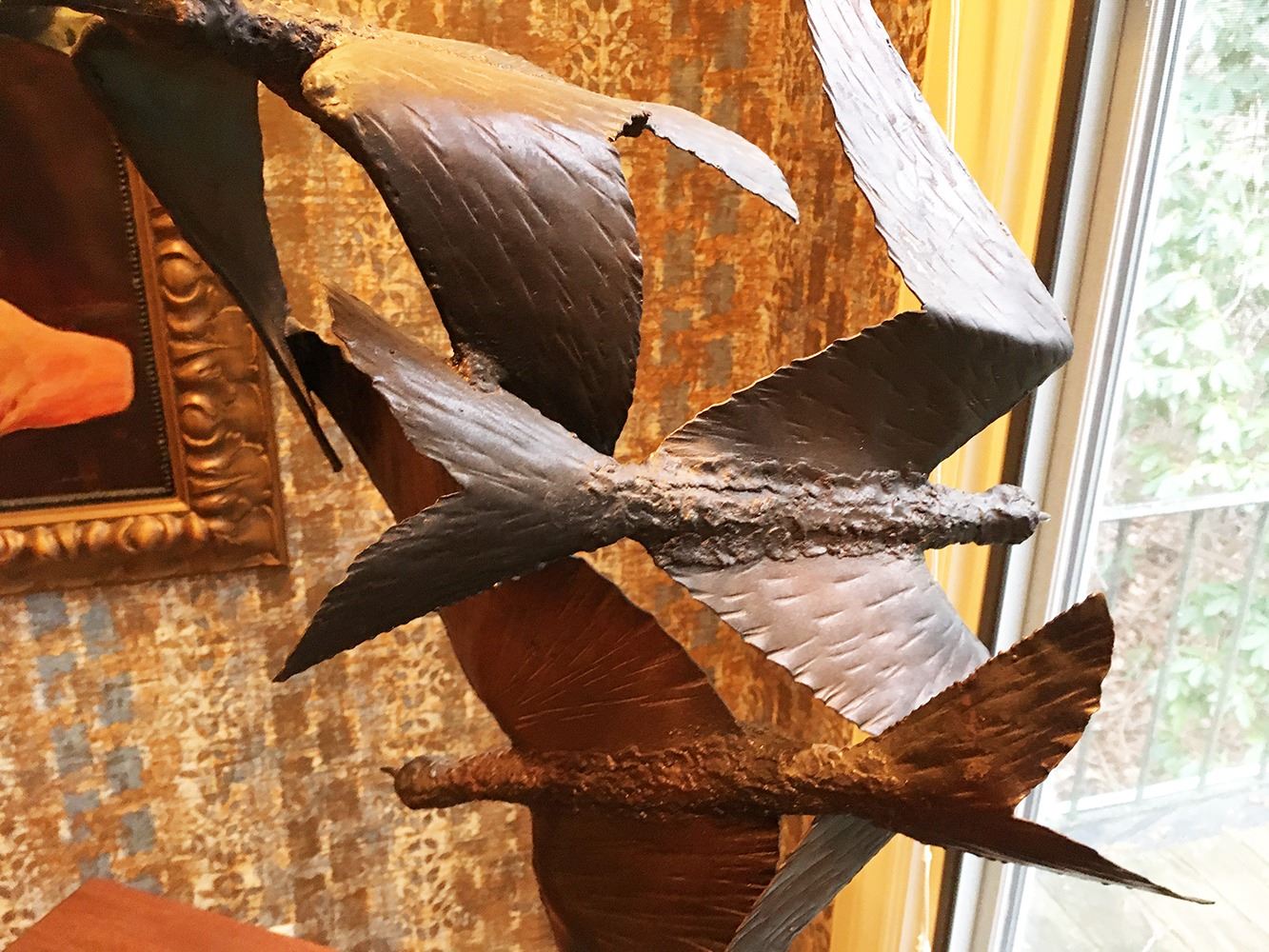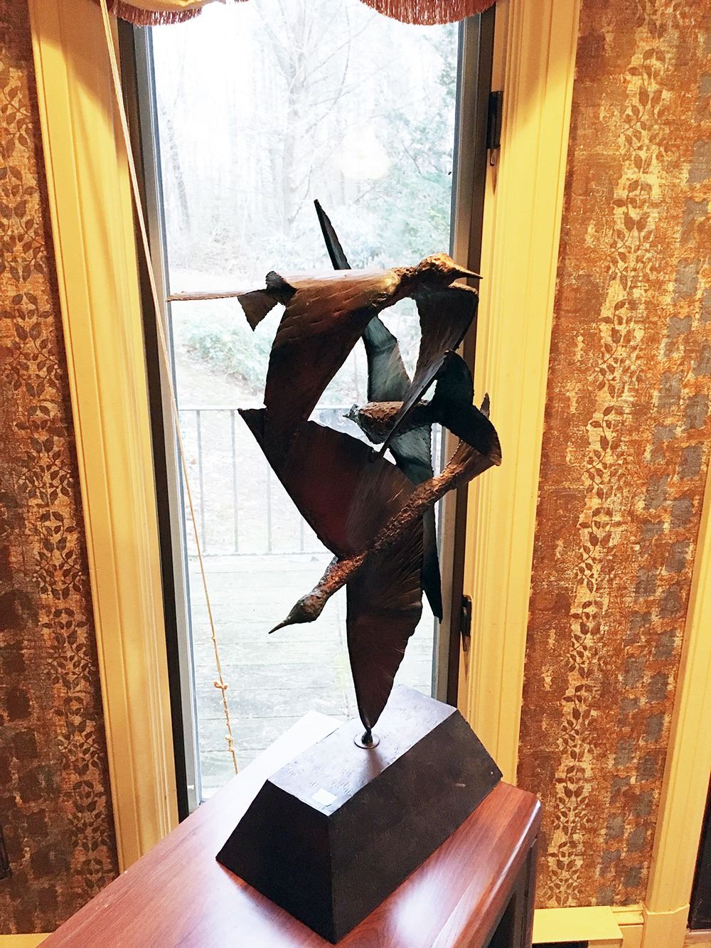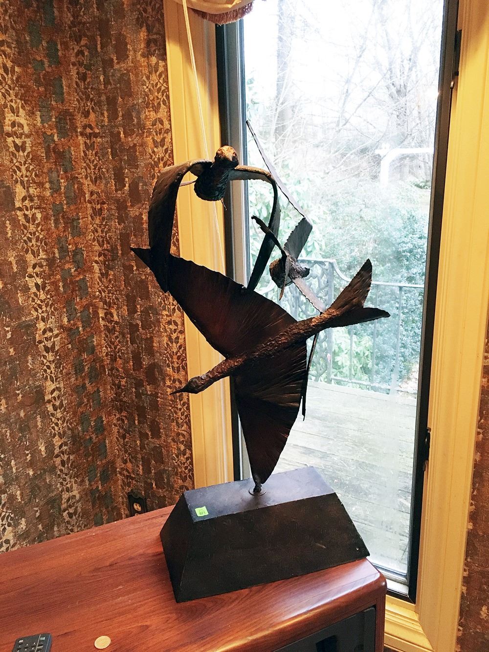Decorative birds in flight metal statue, made in Italy by International House, measures approx. 30 inches tall. pd