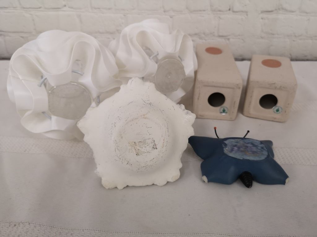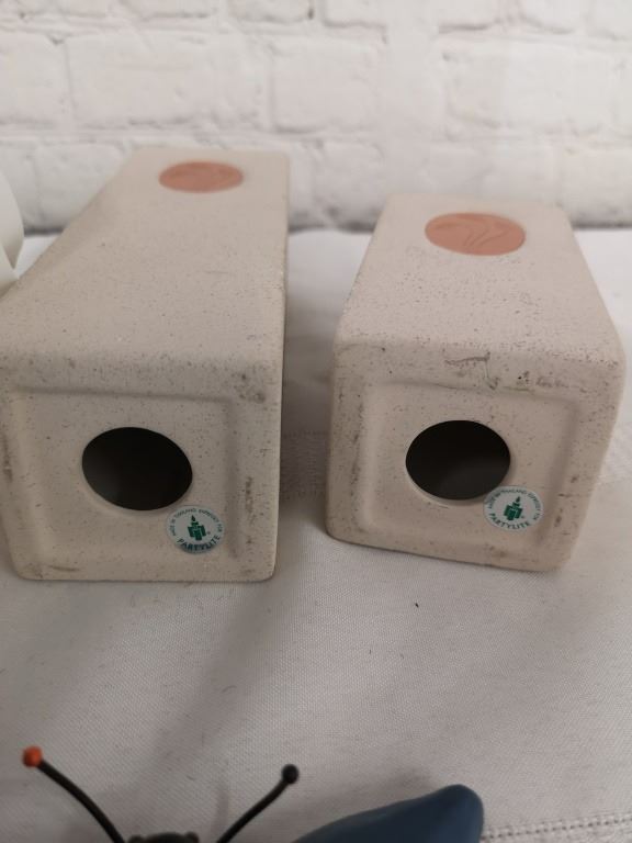 These decorative candle holders come to you in fair to good pre-owned condition with some scuffs and chips on the butterfly candle holder and the white with pink accents candle holder. These candle holders range in