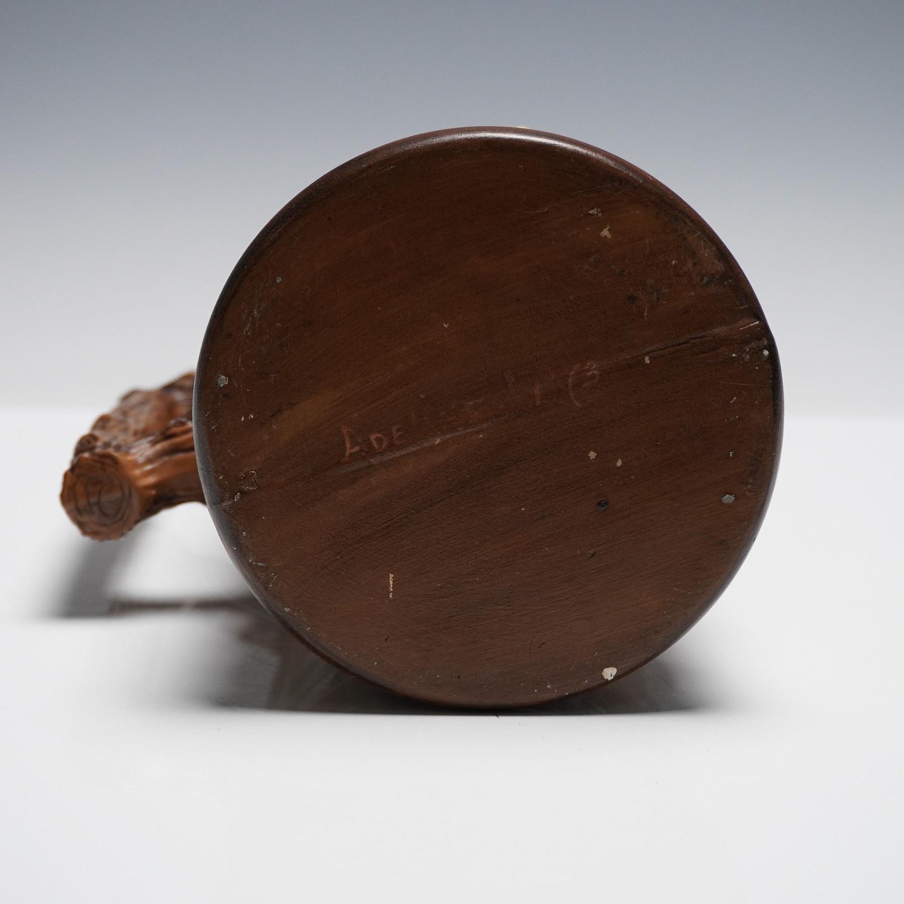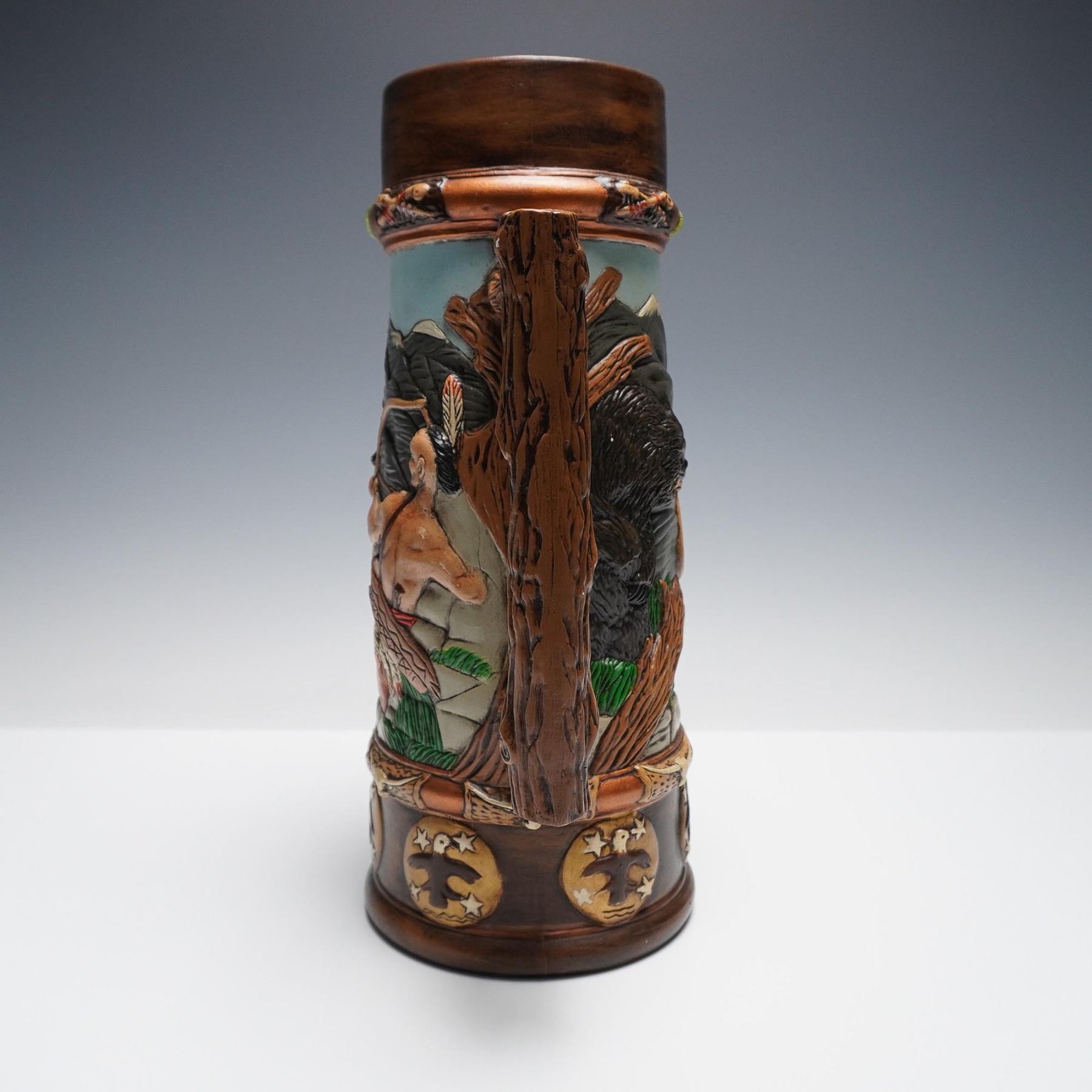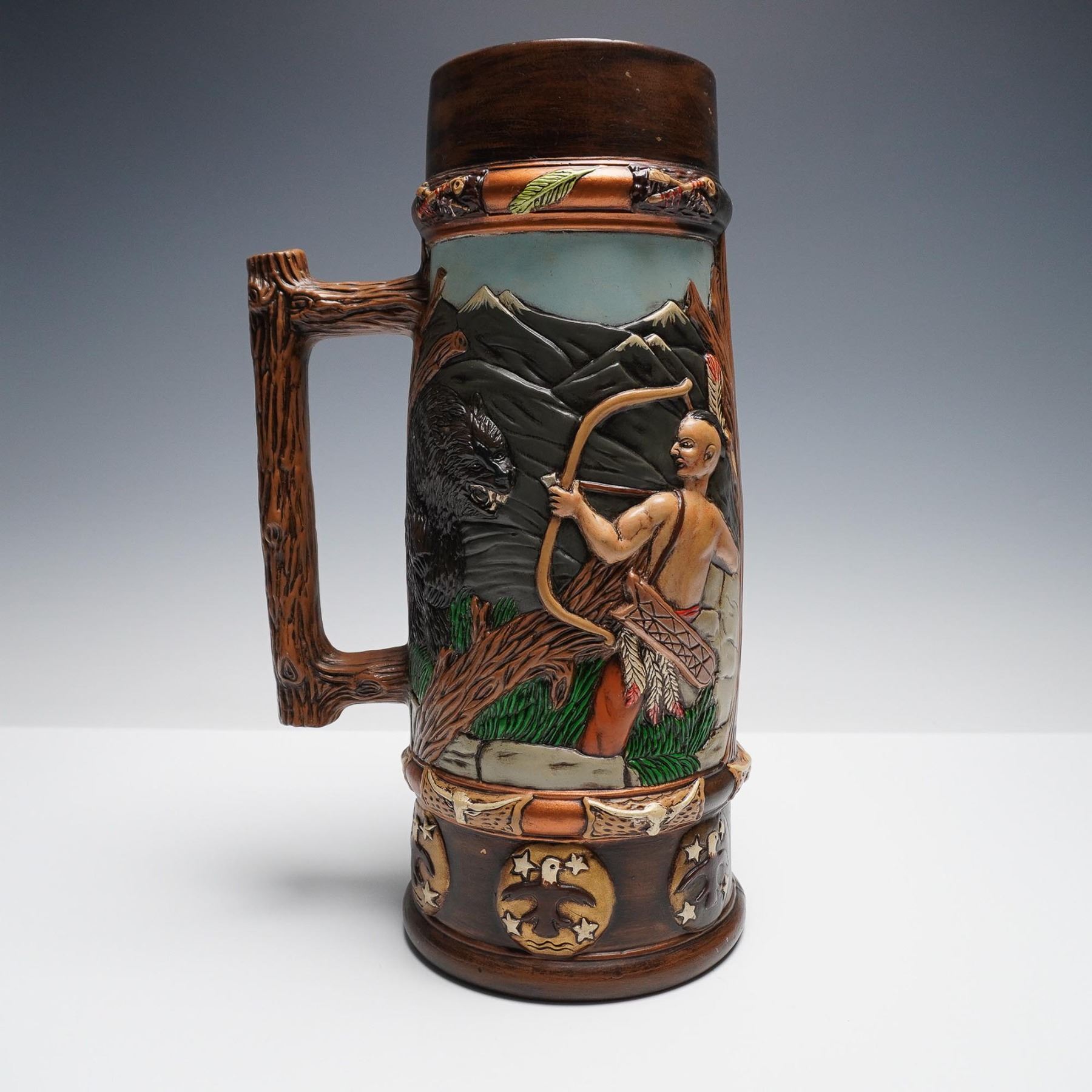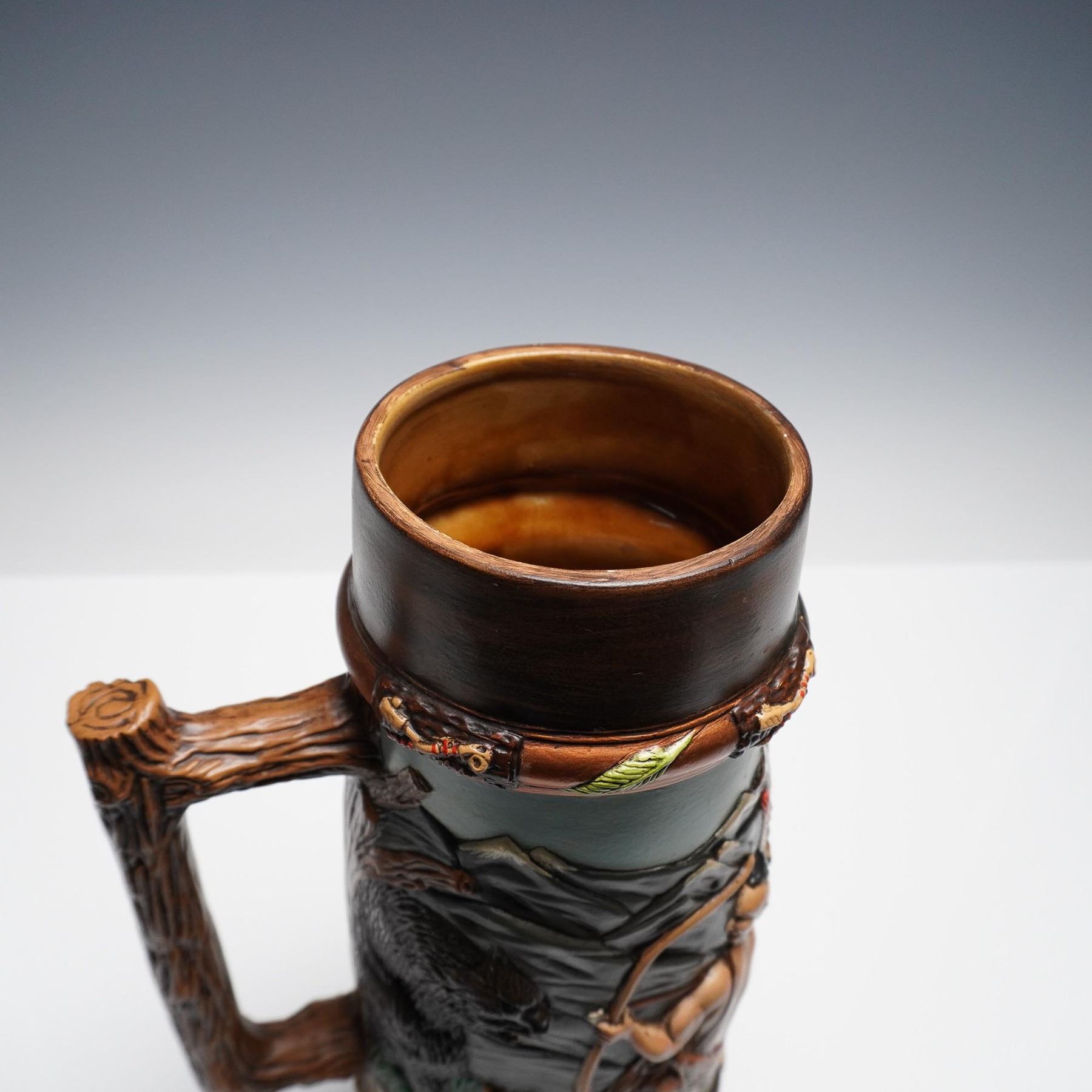 Large hand-painted ceramic stein featuring a high-relief scene of a Native American hunter confronting a bear, with faux woodgrain handle and eagle motifs around the base. Inscribed underside marked "Adeline 1973."