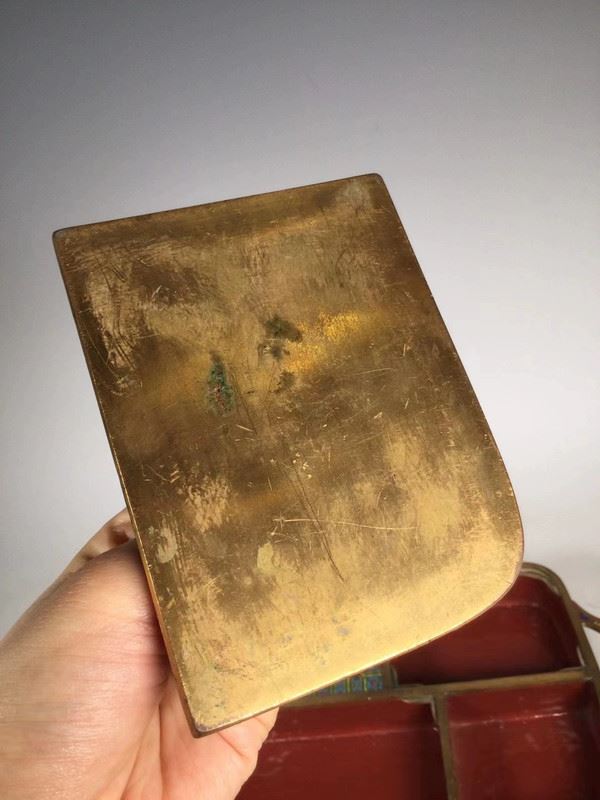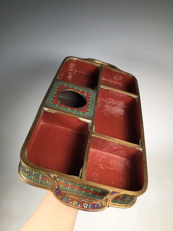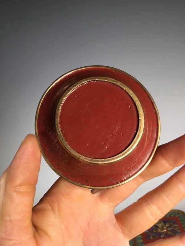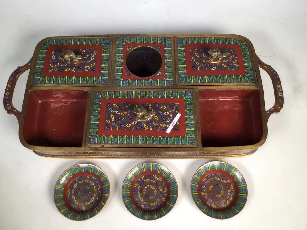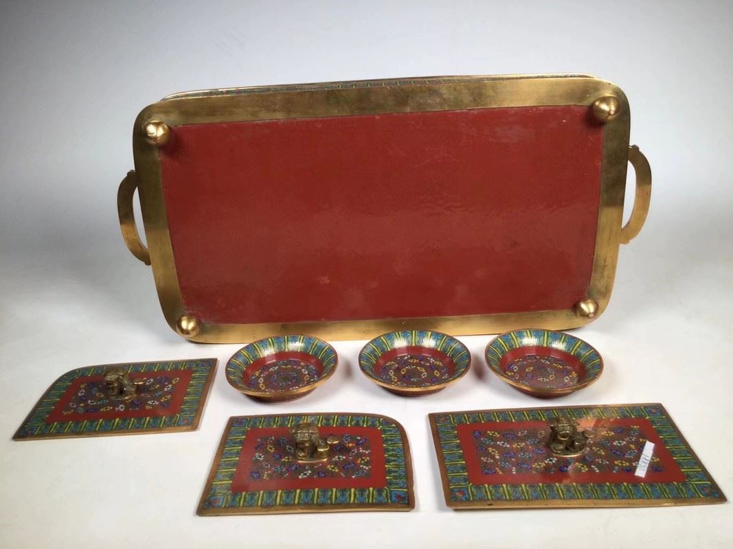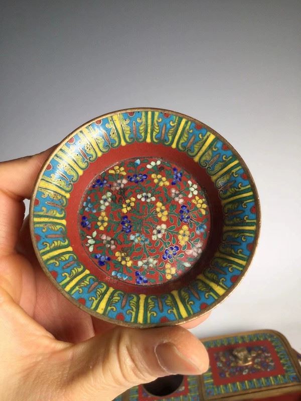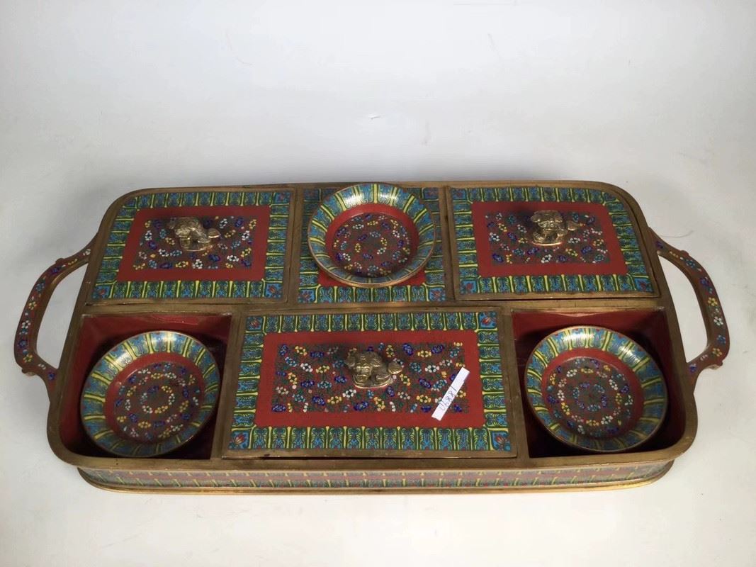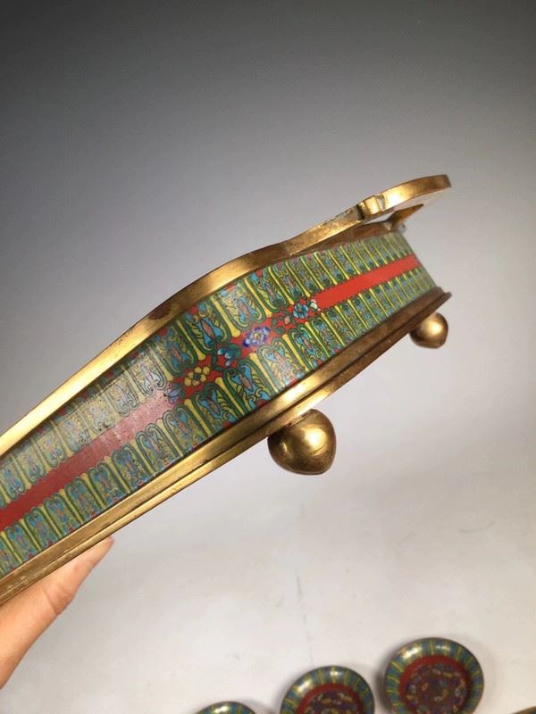 This decorative cloisonné tray comes with four exquisite small round plates, featuring a traditional design with red, gold, and blue tones. The plates are adorned with vivid floral and animal patterns, showcasing fine craftsmanship and an elegant visual appeal. The edges of the tray complement the small plates, presenting a refined artistic atmosphere, perfect for decorative use or as a delicate tea display.