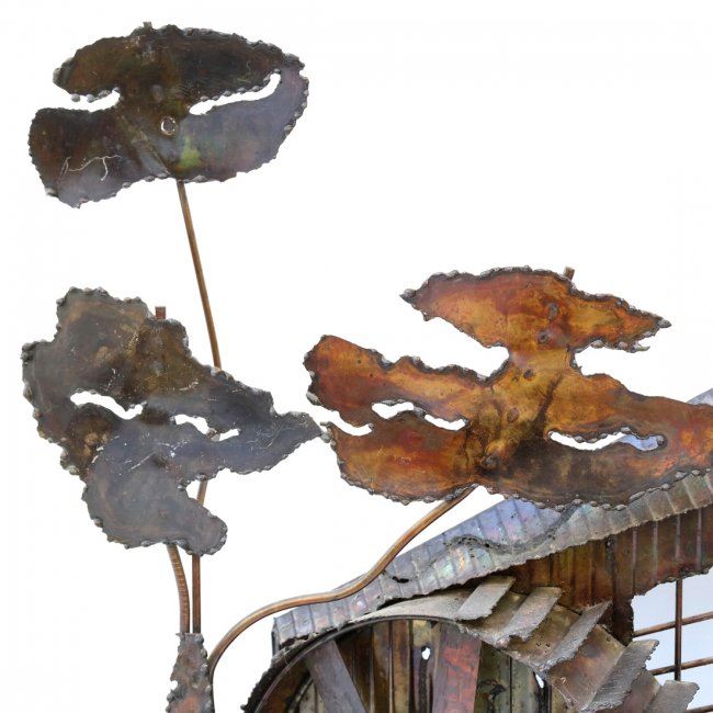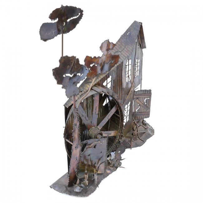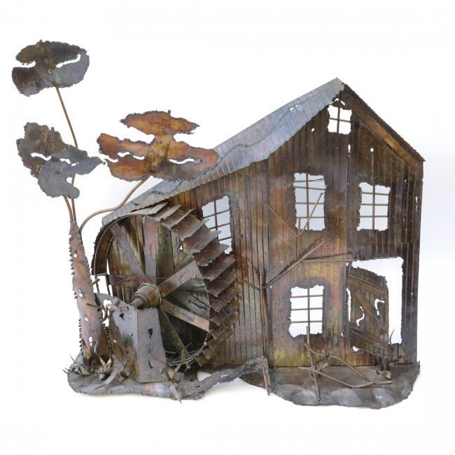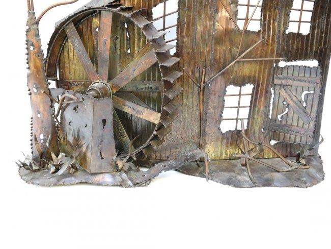Copper wall sculpture featuring a house, mill, wheel and trees. [24 1/2" W x 6" D x 22 1/2" H]. In fair condition, with scratches and scuffs.