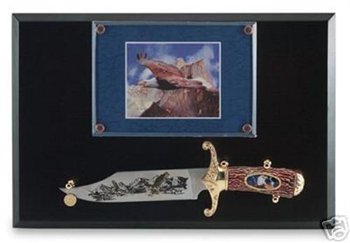 Decorative Eagle Knife on display plaque. Just as the eagle in the scene displayed on this plaque, this display will add majesty to any room or office. The stainless steel blade and gold tone finished guard add a complementary accent to the stag-style handle. Plaque measures 15-3/4" x 10-1/2". Knife measures 11-3/4". Lifetime warranty.