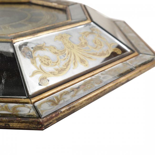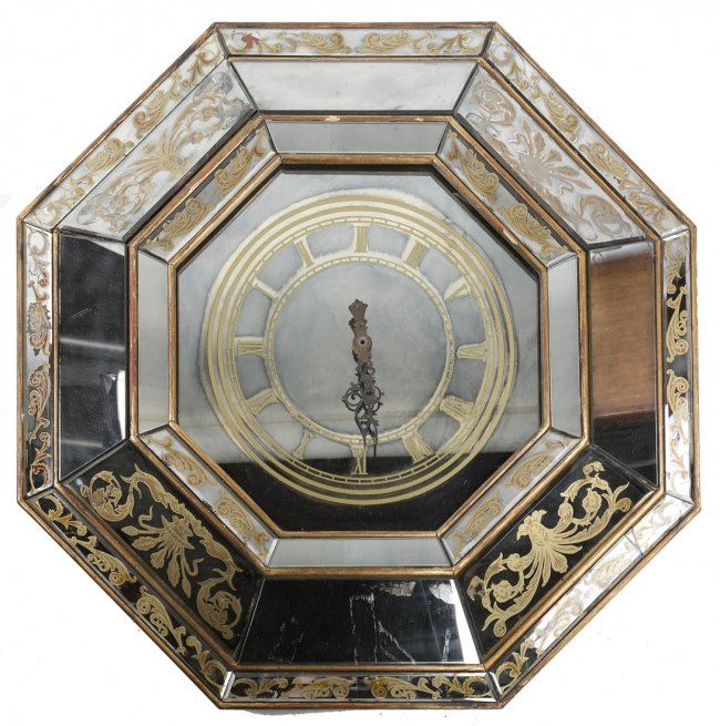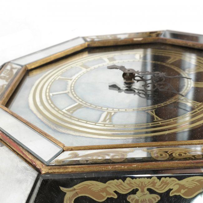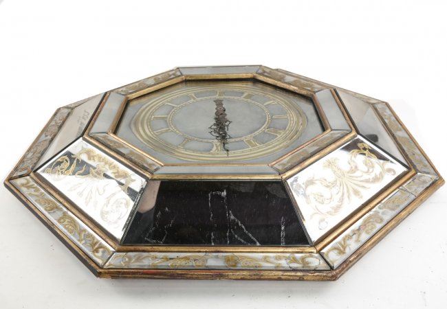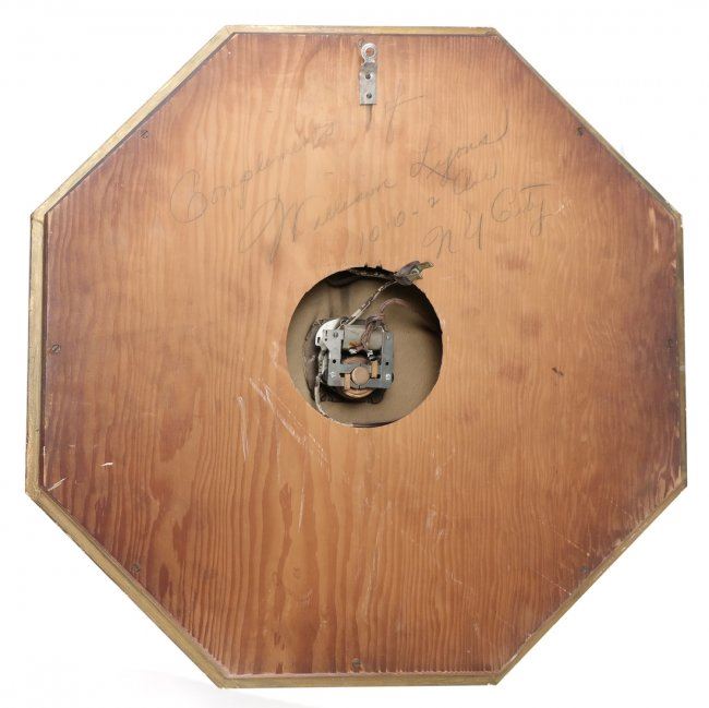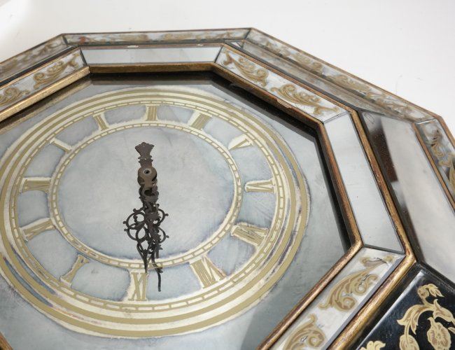Octagonal shaped wall clock with gilt painted accents. [22" Dia]. Sporadic losses to paint and chips on the glass.