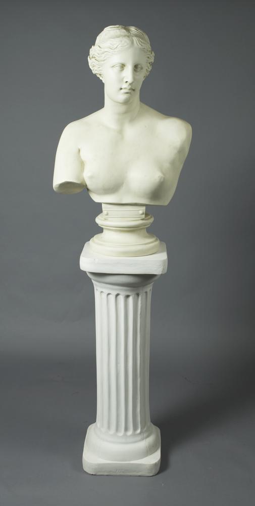Bust of nude female looking to her left on circular base, 33" H x 19" W x 13" D. Rests on plaster column pedestal, 36" H x 13" Sq.