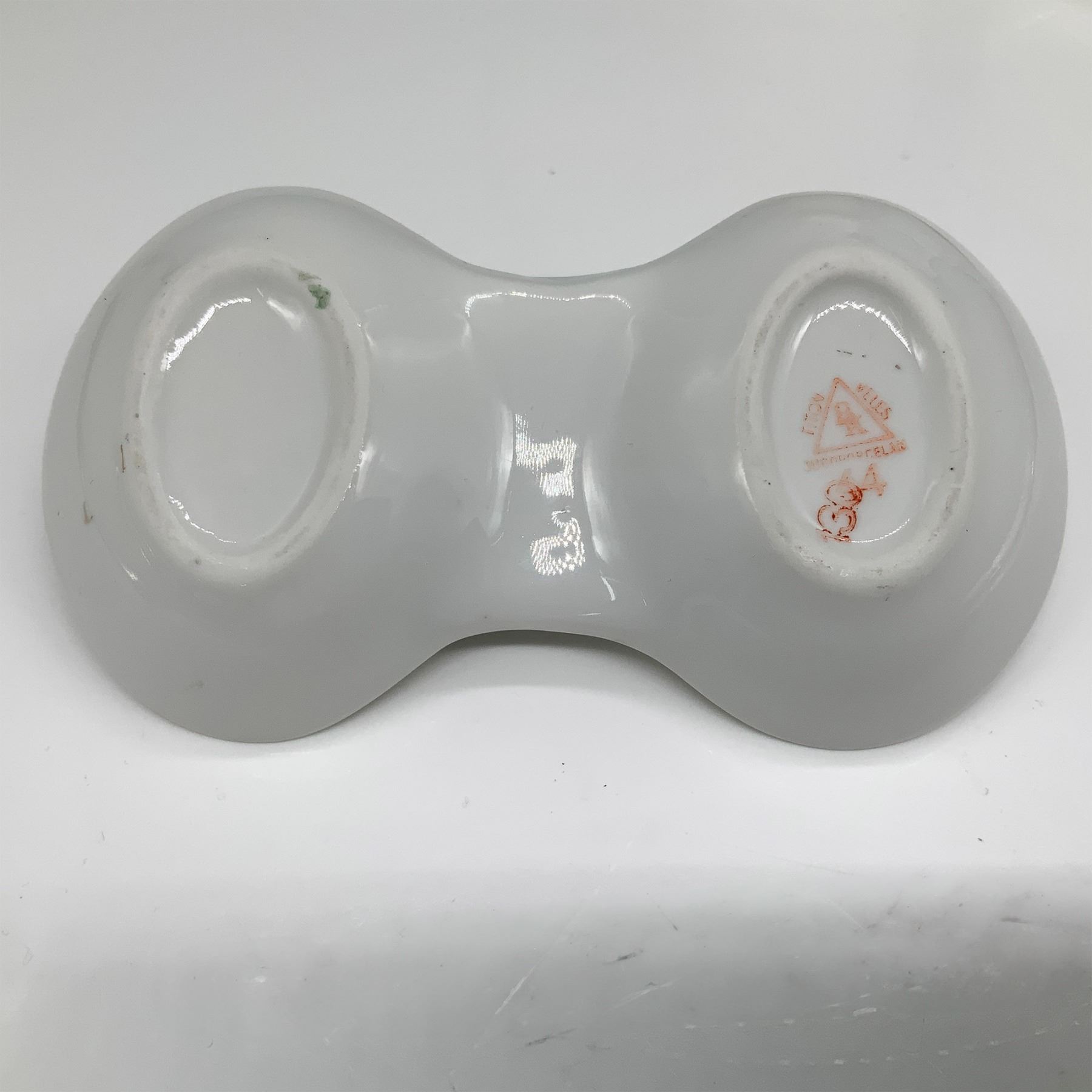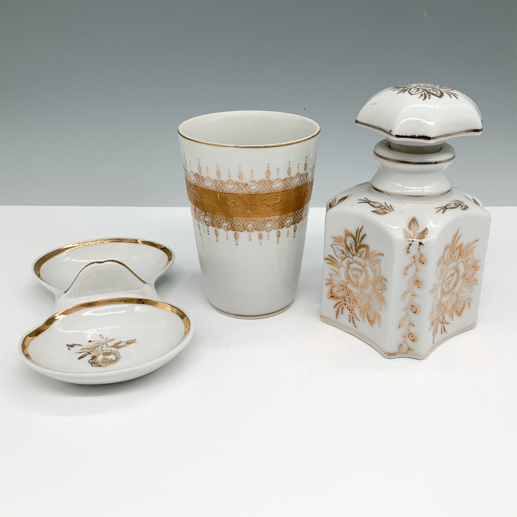 A porcelain vanity set featuring gold accents, including a double dish with floral motifs and gilded trim, marked Jugoporcelain Titov Veles. The set also includes a decorative cup with an intricate gold band and a square-shaped perfume bottle with a matching stopper, both adorned with raised gilt floral detailing. The pieces exhibit fine craftsmanship with hand-painted elements and are marked with model numbers. A refined addition to any vintage porcelain collection. Tallest item: 5"H.
