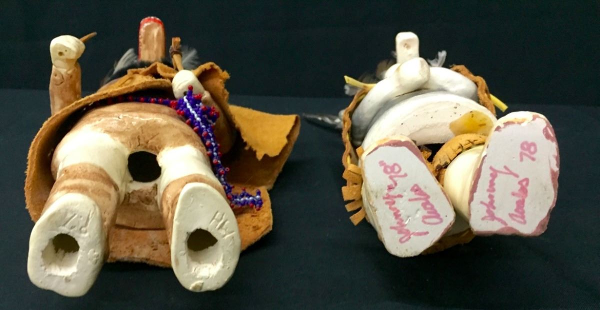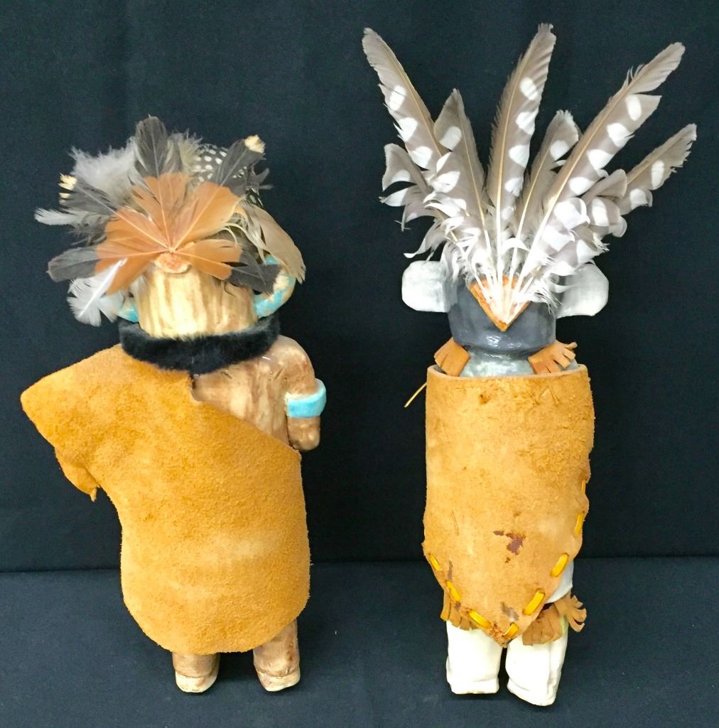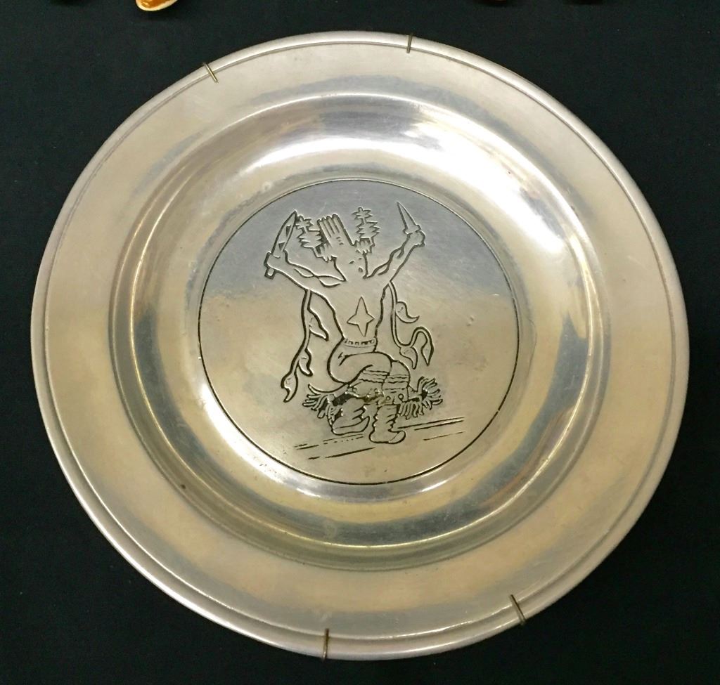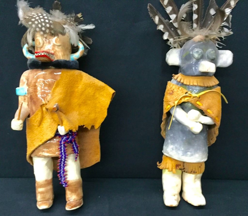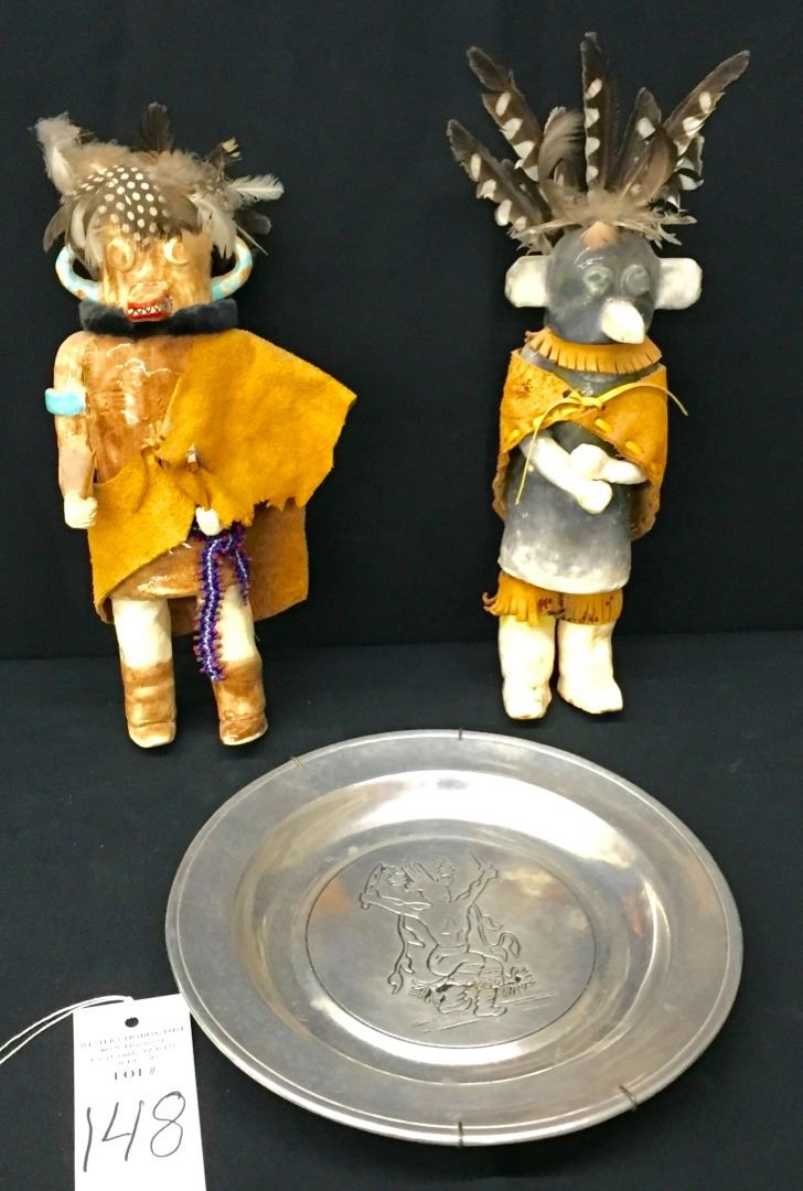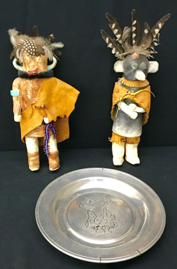 There is a pewter plate with an Apache dancer on it which measures 10.5 inches across. The two kachinas are both ceramic and signed and dated 1978. Each stands approximately 13 inches tall. Please look closely at pics - they are an important part of our description. Shipping: There will be a $7 handling / packaging fee for shipping this lot. The actual cost of postage will be added on top of that.