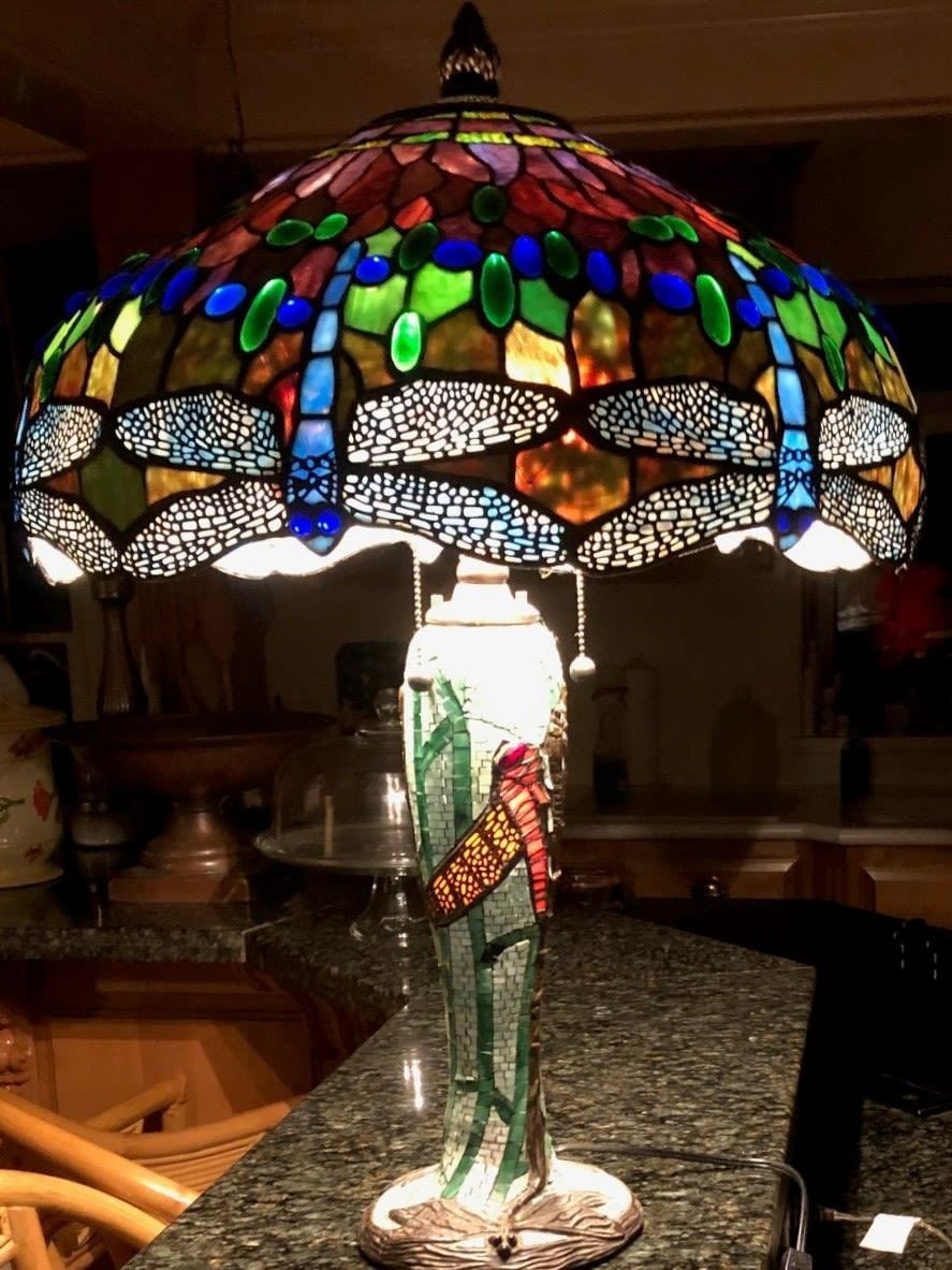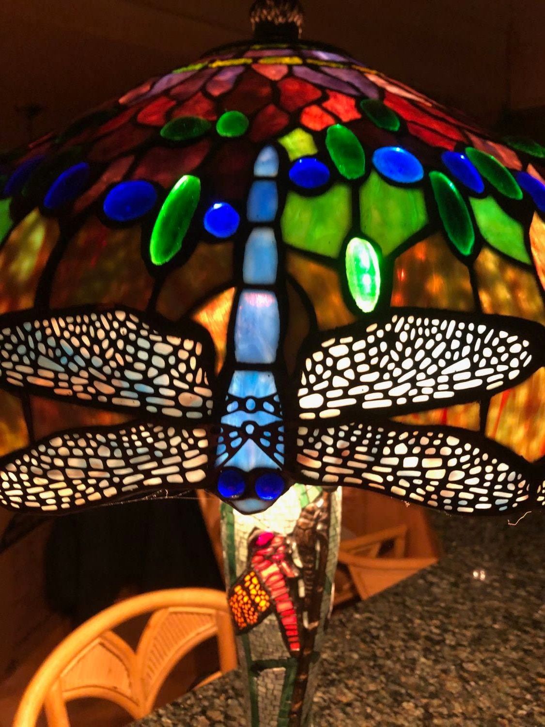 Decorative Leaded Tiffany Style Lamp w/ Dragonflies. Approximate dimensions 30†h x 20 1/2â€w.