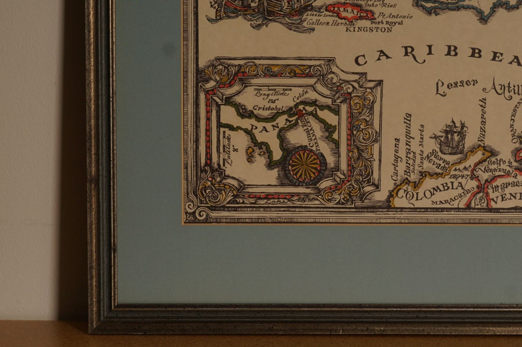 Framed decorative map titled The West Indies, featuring a richly illustrated depiction of the Caribbean region with artistic flourishes reminiscent of early cartographic styles. The map includes detailed renderings of islands, ships, and compass roses, bordered with ornate scrollwork and a smaller inset of Panama. Presented with a light blue mat and antiqued wooden frame, the piece blends historical charm with decorative appeal. A refined wall display for admirers of vintage maps and maritime art.