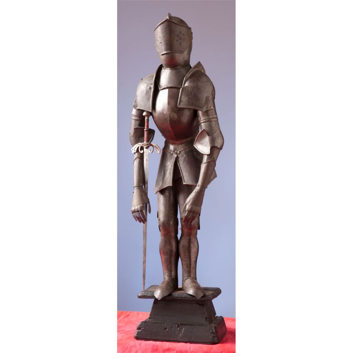 Decorative Miniature Suit of Armor with Broadsword. Of stamped and riveted sheet metal construction, the close helmet with stamped viewing holes in visor. Sold with associated broadsword. Mounted on a rustic wooden plinth. Height: 29-inches. Condition: Fair to good. Metal with age wear and patina. Some light surface spotting present.