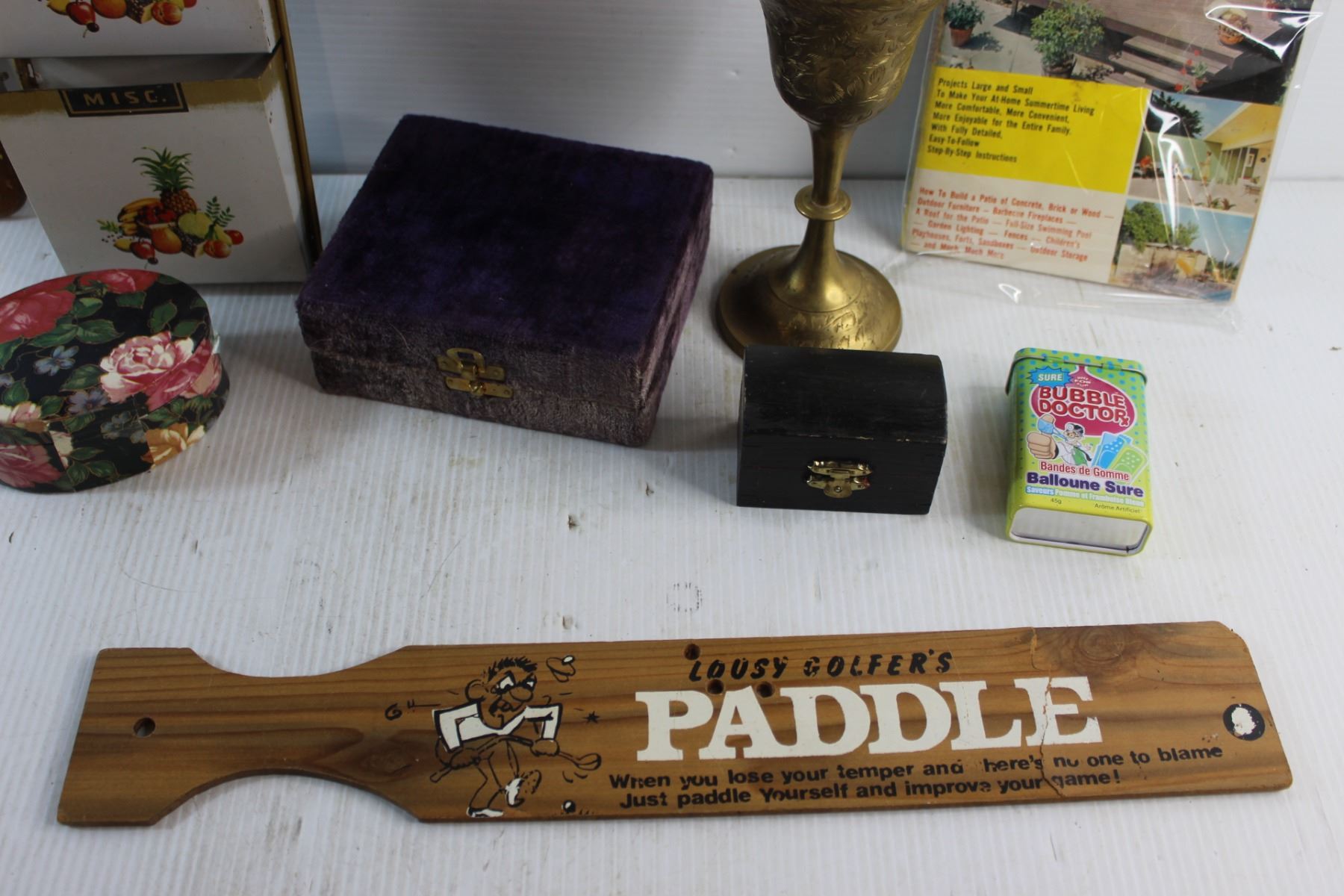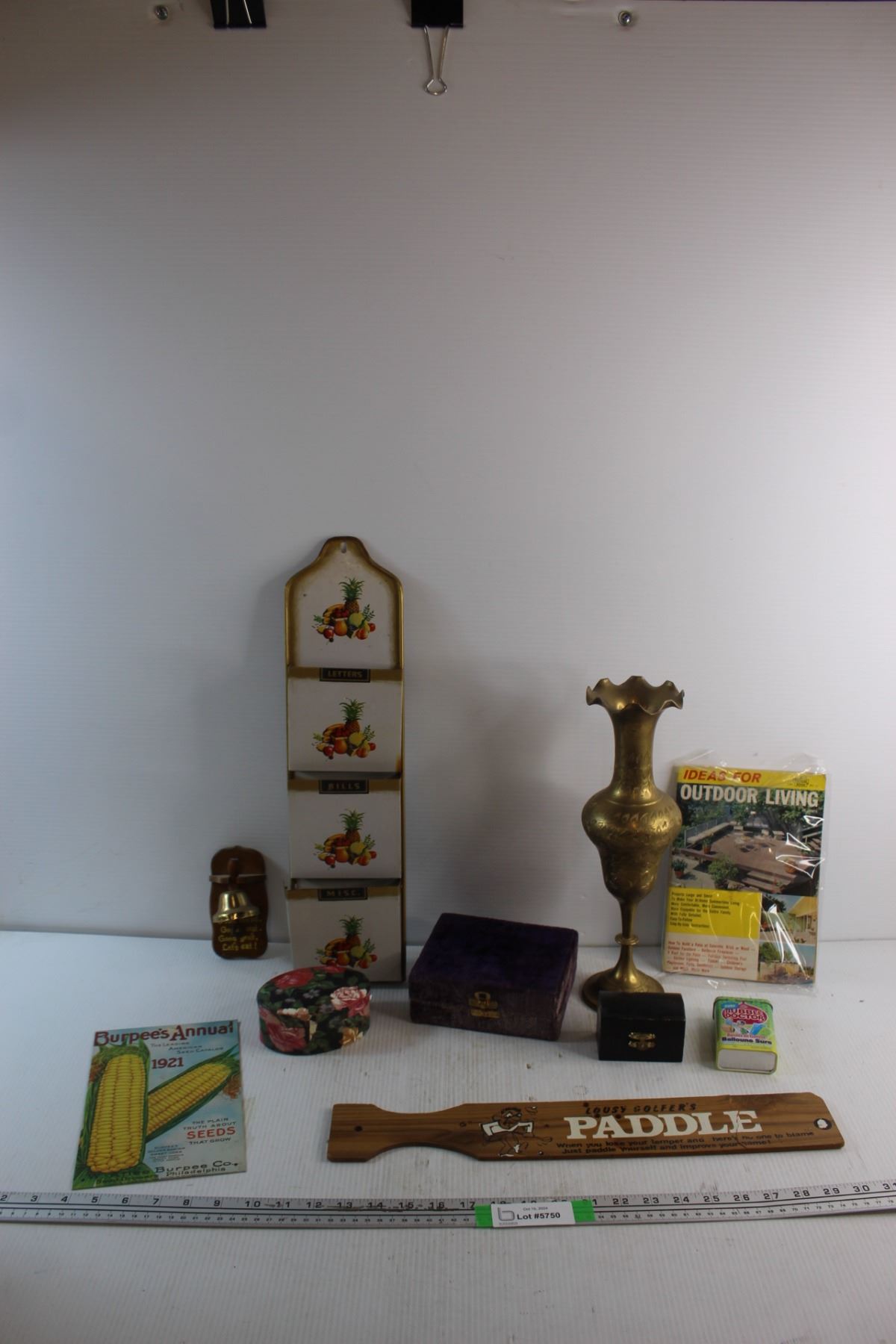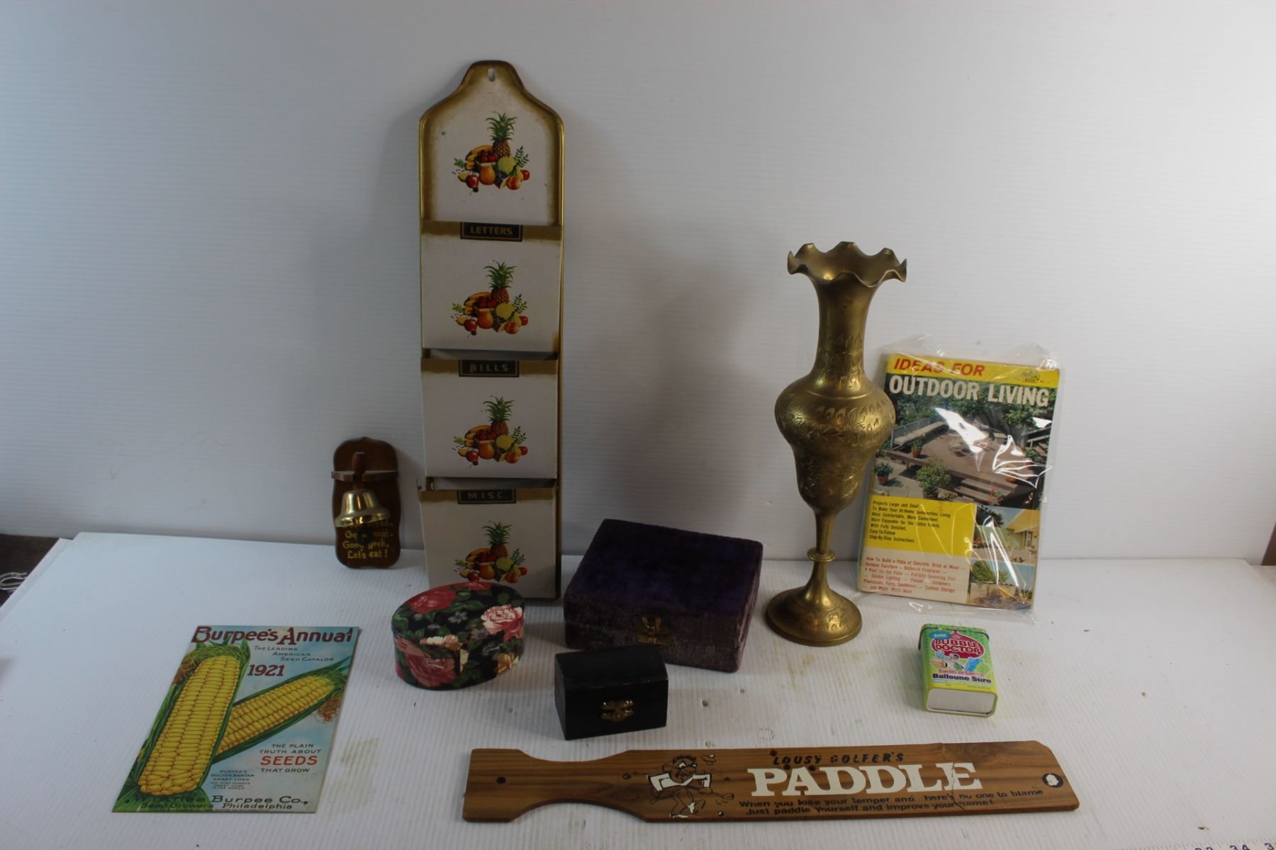 Decorative Paddle, Document Organiser Rack, Bell, Brass Vase, Jewelry Box and Assorted Items