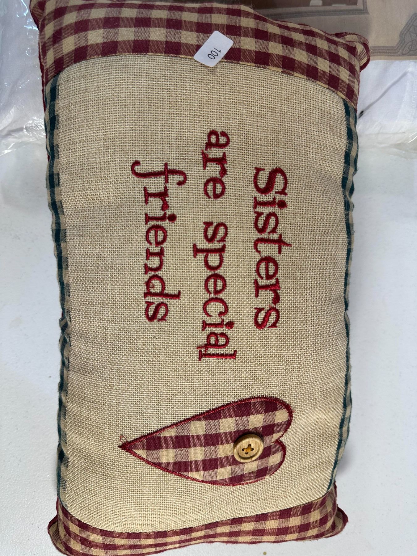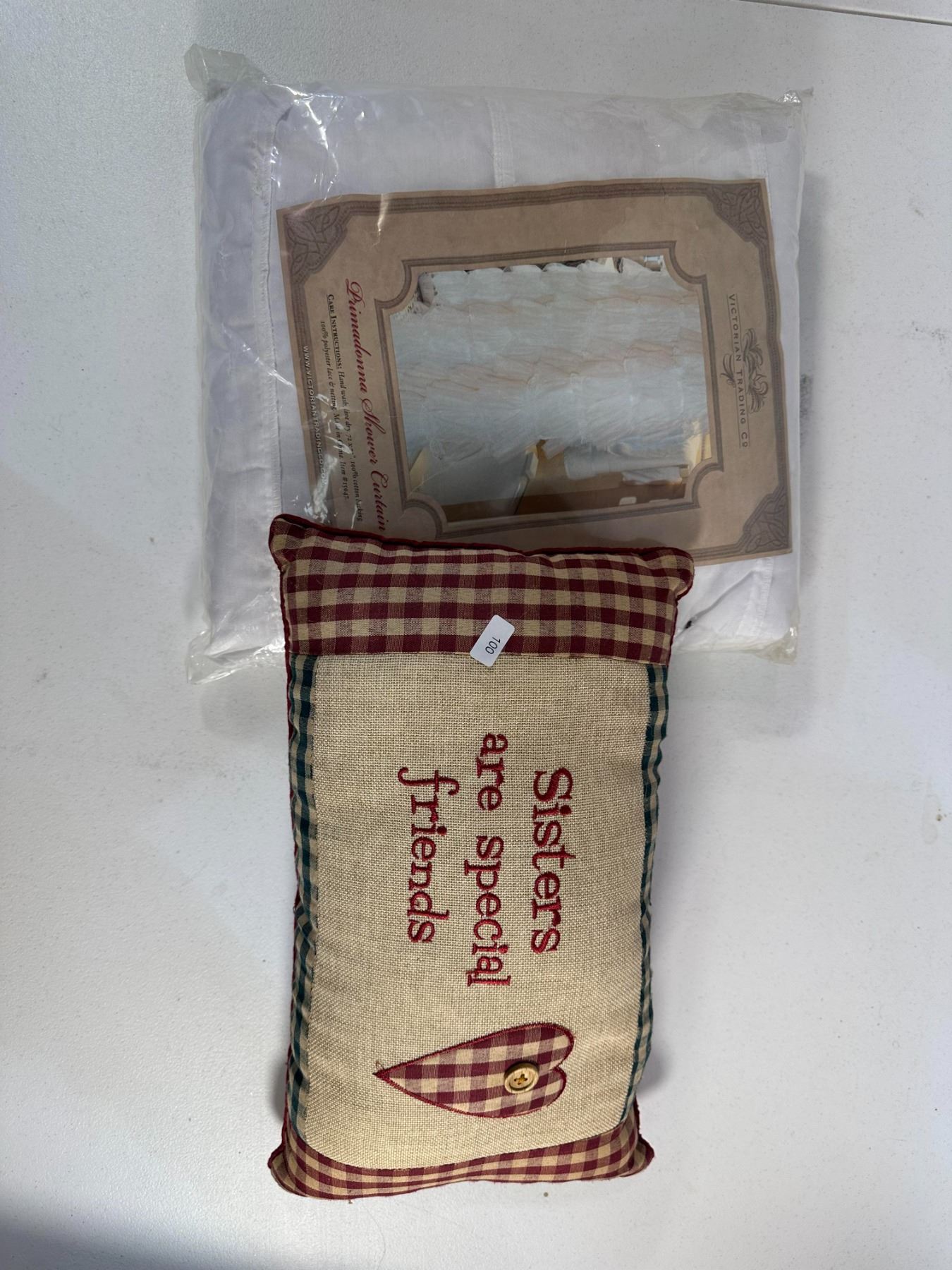 Includes a charming country-style pillow with stitched message 'Sisters are special friends,' plus a new-in-package set of sheer curtains by Victorian Trading Co. perfect for cozy or vintage-inspired décor. Contemporary country style. Pillow in good condition; curtains sealed in original packaging.