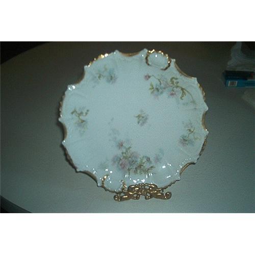 Gold Trimmed edges, with pale pink, blue, and green long stemmed flowers.The plate is decorated with a star and also a bell on the back which has the initials: "T.V." France is also stamped in green. A bell stamped on the bottom with the letters: HANC. A gold plated stand came with the plate and displays 2 cherubs. Both pieces together are lovely. Excellent condition. No chips, cracks, etc. Some of the gold painted trim is worn, but, otherwise unremarkable.