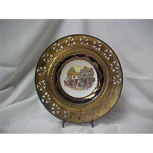 This decorative piece is a porcelain plate with a metal rim and has an English scene, ?Old Coach House ? Bristol?. There are gilded decorations on the porcelain. The plate/rim is 10? in diameter. The plate says ?Old Coach House ? Bristol?. Marked, ?Regency Bone China Made in England?. Fair condition.Year unknown