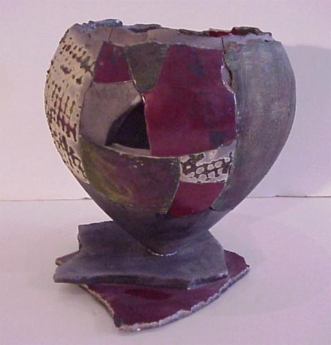 Decorative Raku Ceramic GREY/OLIVE VASE, multi-shard Raku fire ceramic vase with plate footing, 8 1/2" high.