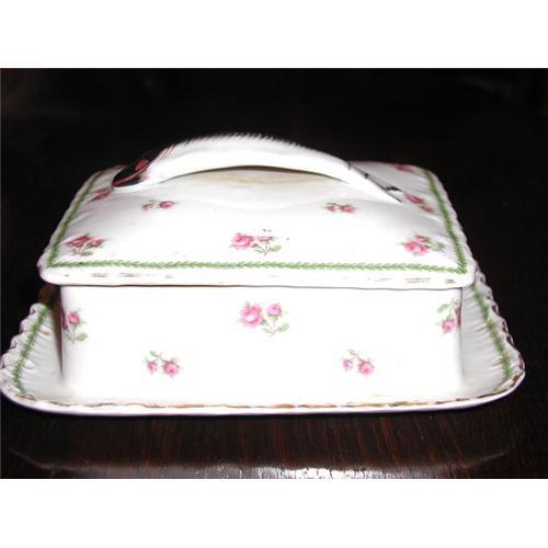 Beautifully Decorative Sardine Covered Dish. Made in Austria. Top has black sardine attached which serves as the dish's handle. Cover as well as dish is decorated with red roses and green trim. On the bottom is a Green Crown with the words "Victoria" over the crown and "Austria" under the Crown. Great condition. No chips or cracks. Bottom does show signs of use.