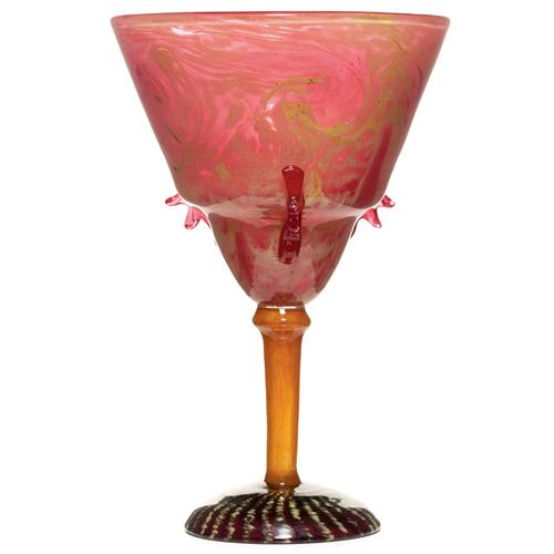 Decorative Schneider vase, footed and flaring form in pink, yellow and purple glass with pulled designs throughout, three applied pink accents at sides, incised signature to foot, 12"h