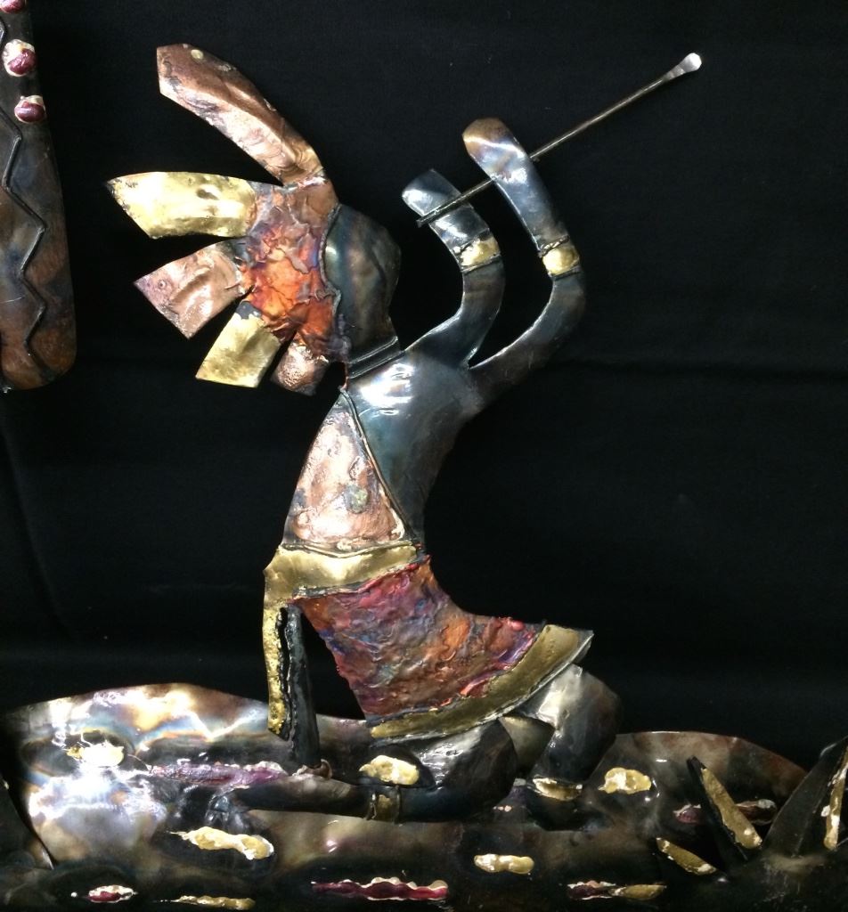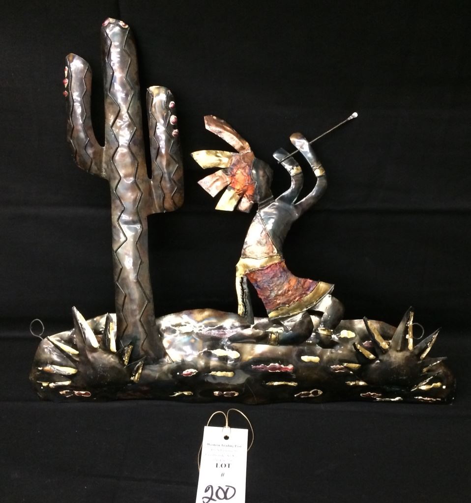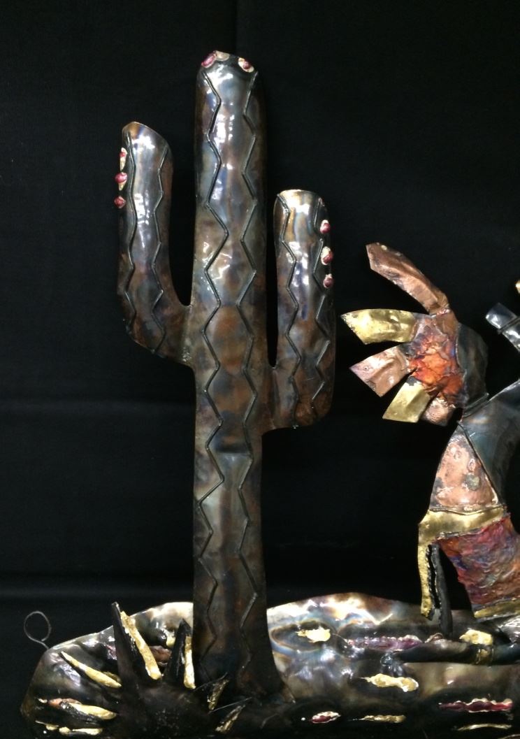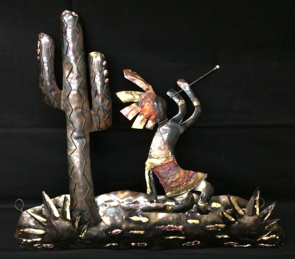This Kokopelli and Cactus scene is made of sheet metal, is hand painted (look closely at pics) and measures 21” wide x 18” tall. Good condition. Shipping: There will be a $7 handling / packaging fee for shipping this lot. The actual cost of postage will be added on top of that.