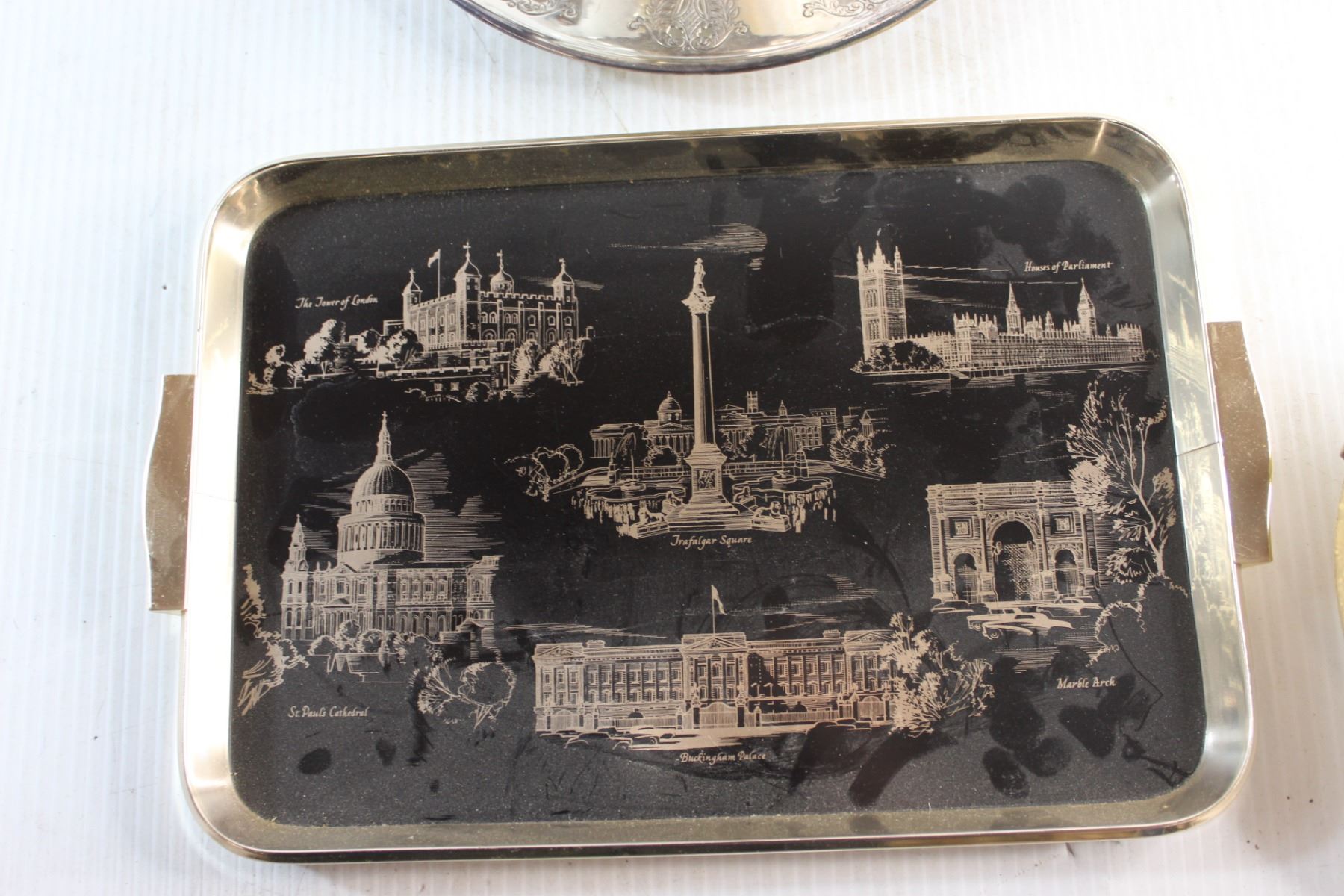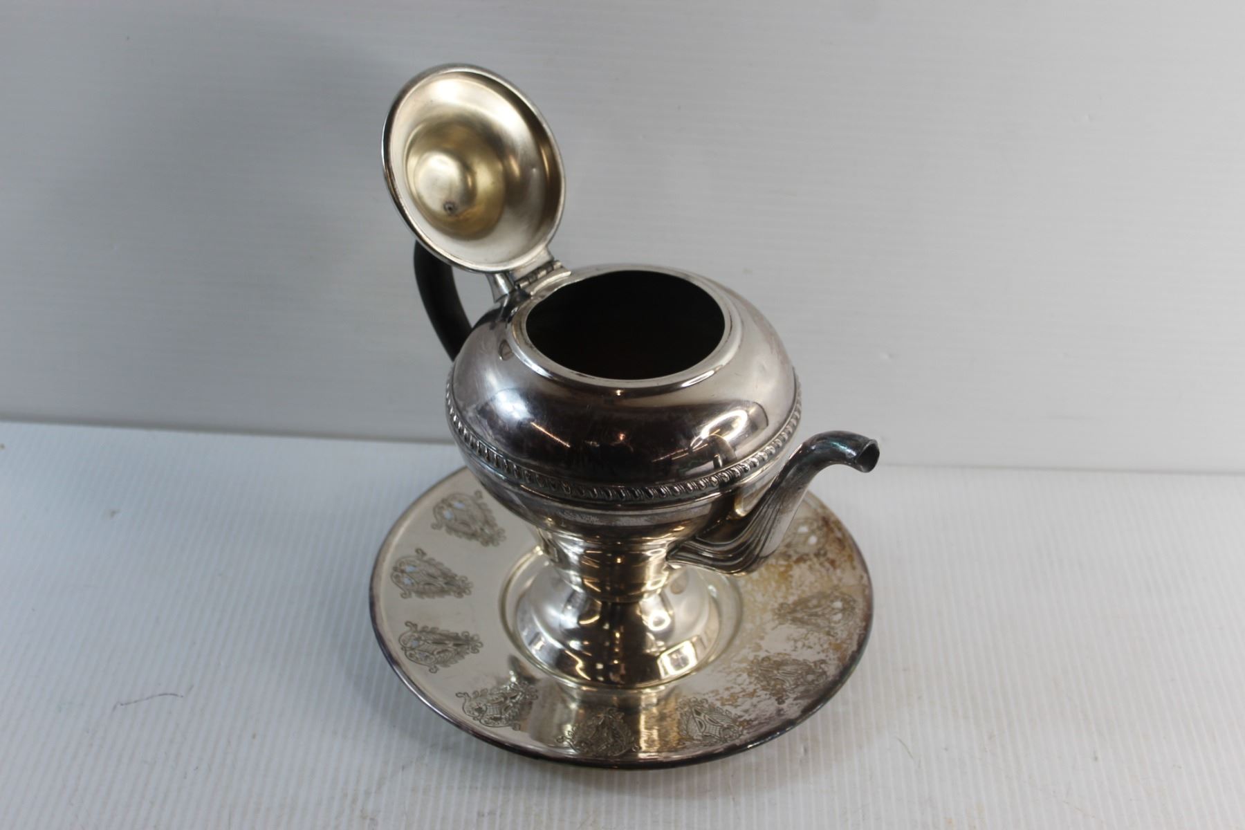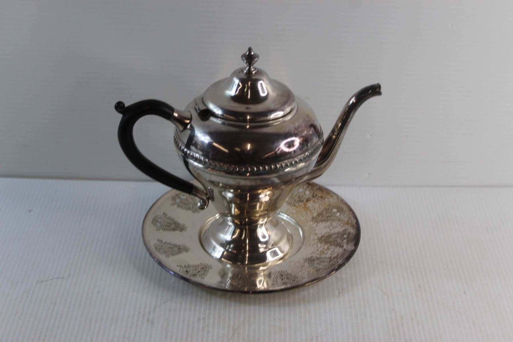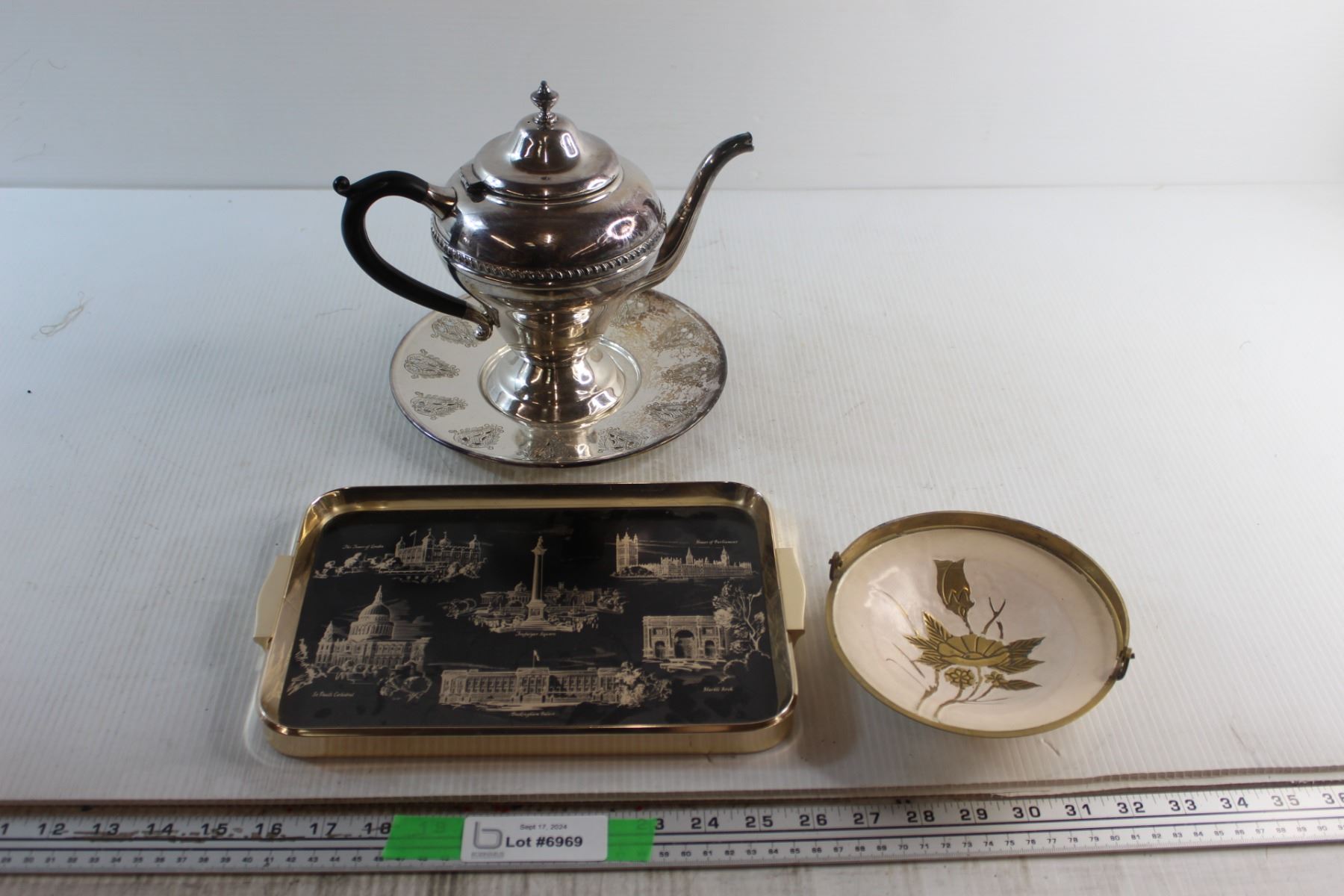 Decorative Silver Tea Pot, Serving Tray and Decorative Plate