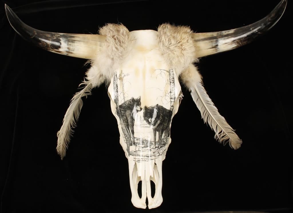 Appealing steer skull with decoupage image of two wolves with fur bands and feathers on horns, signed B Aeki.