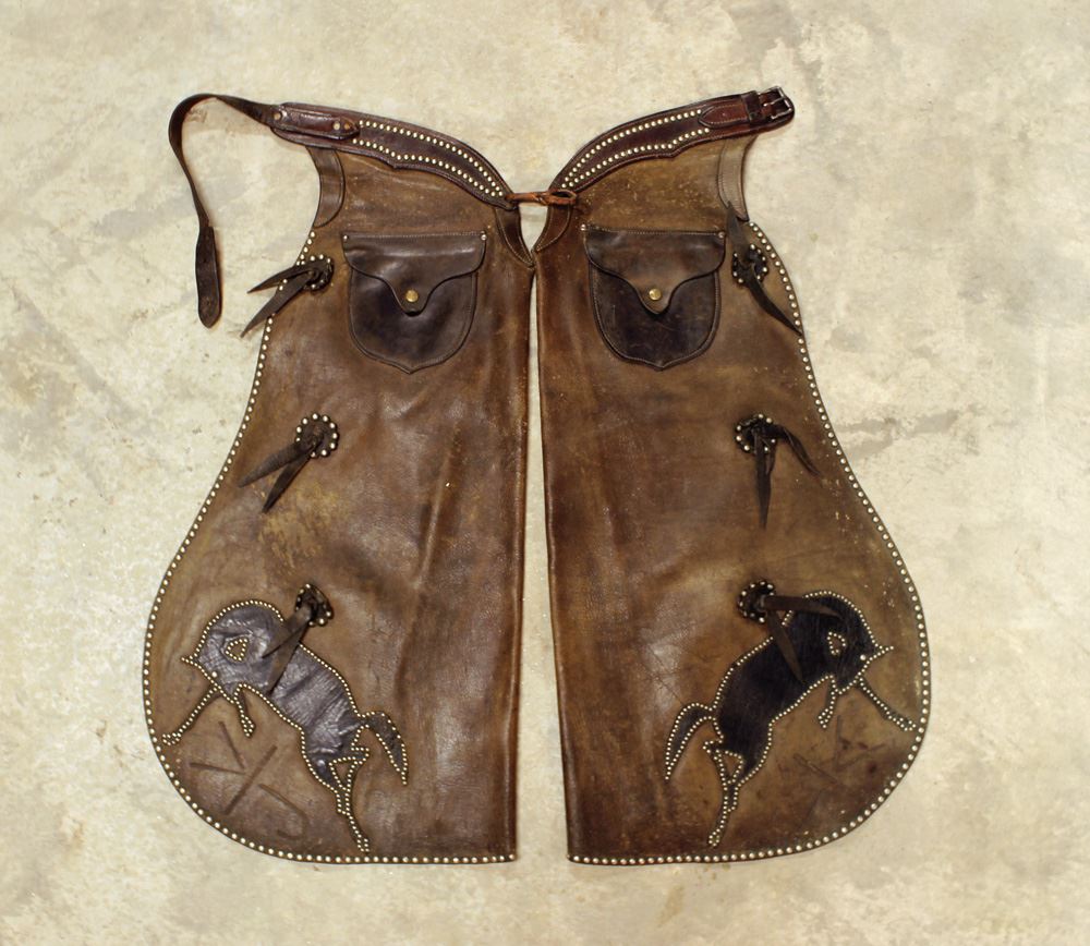 Eye appealing large two-tone studded batwing chaps with applied leather bucking horse overlay, studded belt, and pockets. Measuring 40" in length.