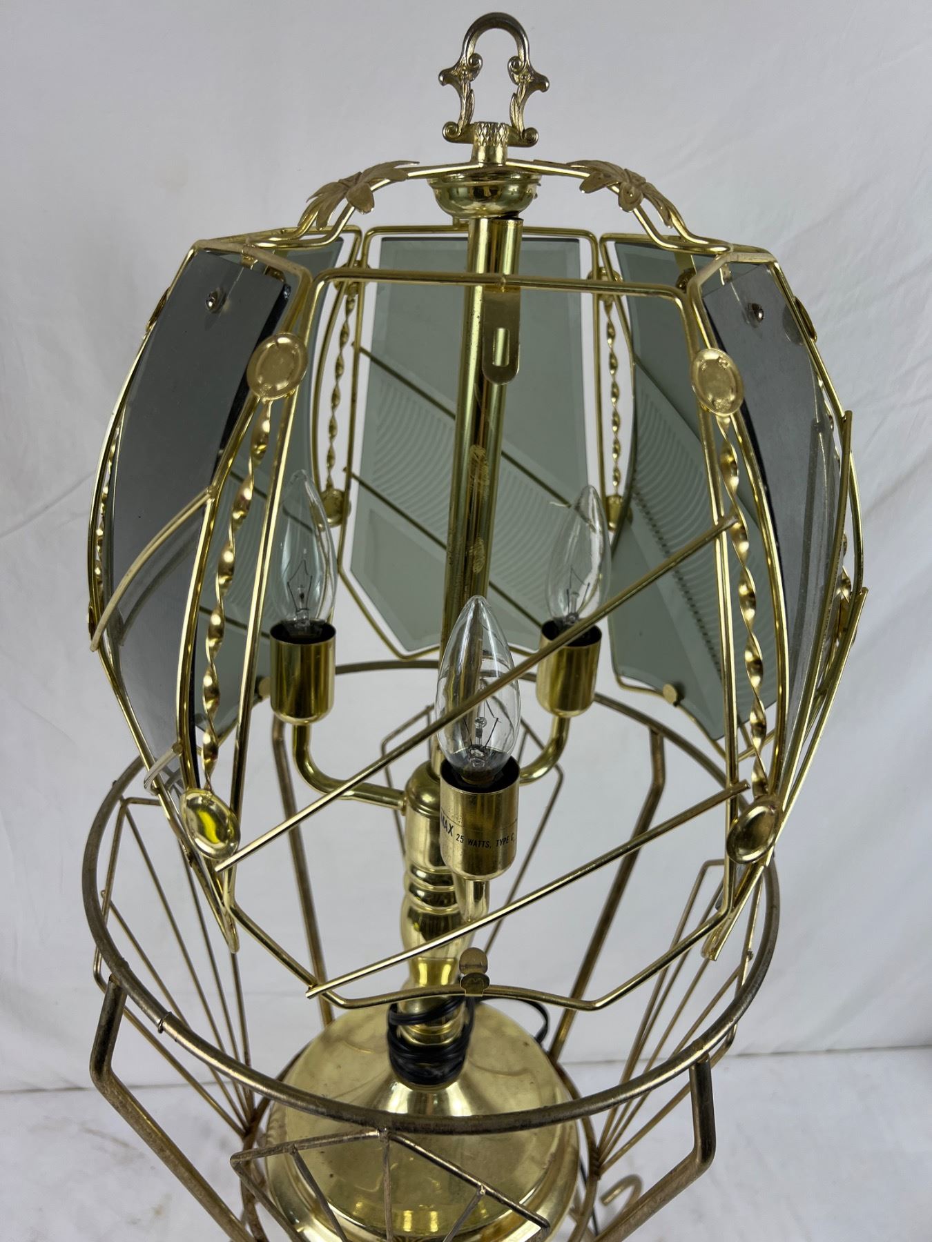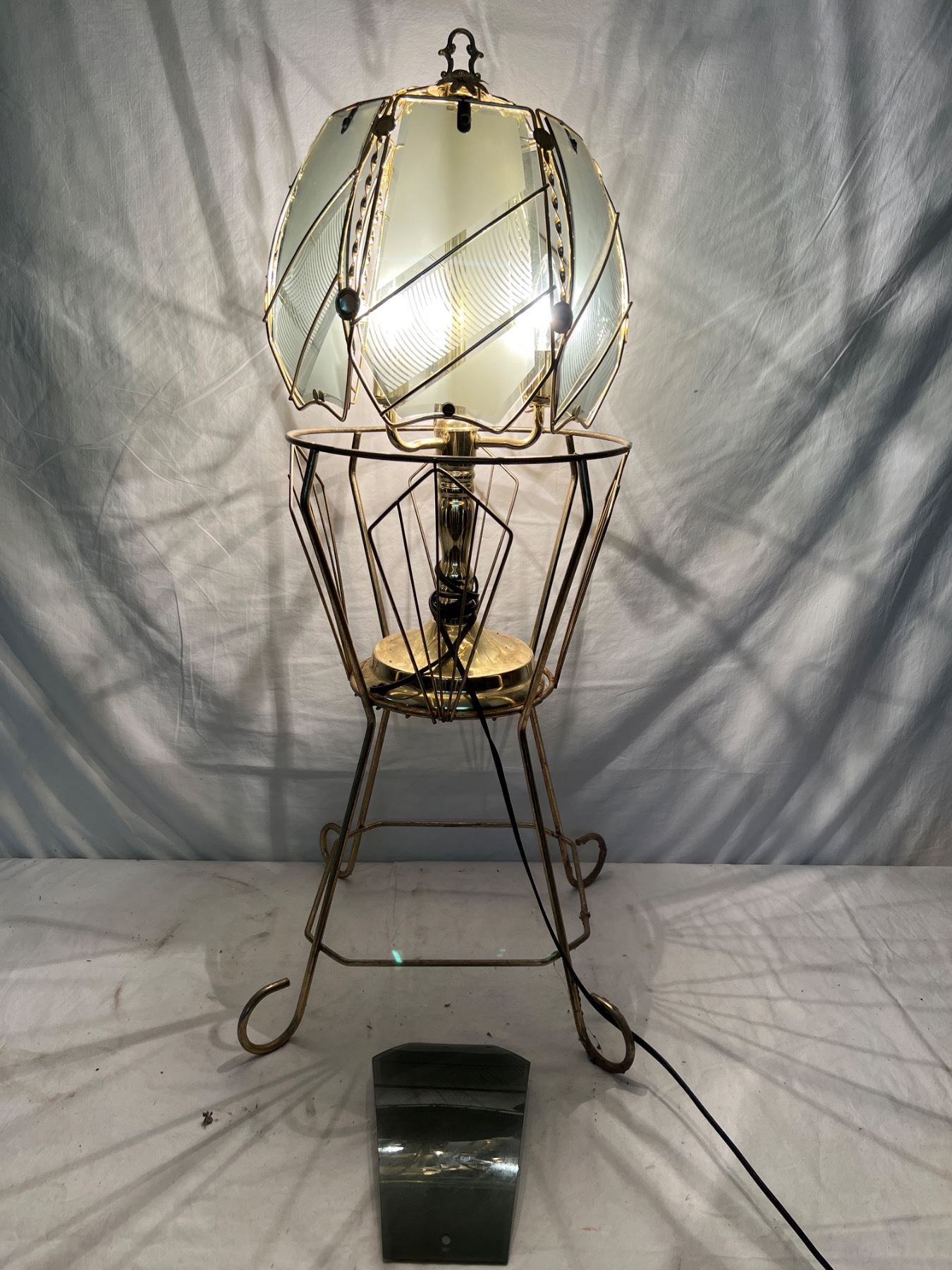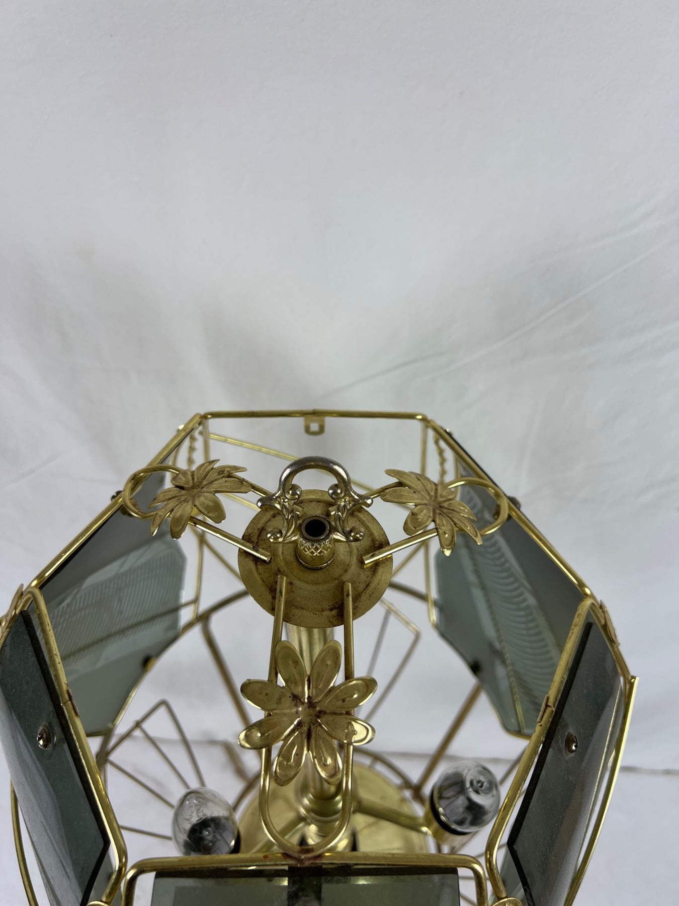 Measures 34" tall by 12" in approximate diameter at widest point of lamp shade. Glass panel missing set screw. Unknown if touch features working. Had old bulbs for first set of testing where touch was working, was swapped as they burnt out and touch feature is not responding with new bulbs.