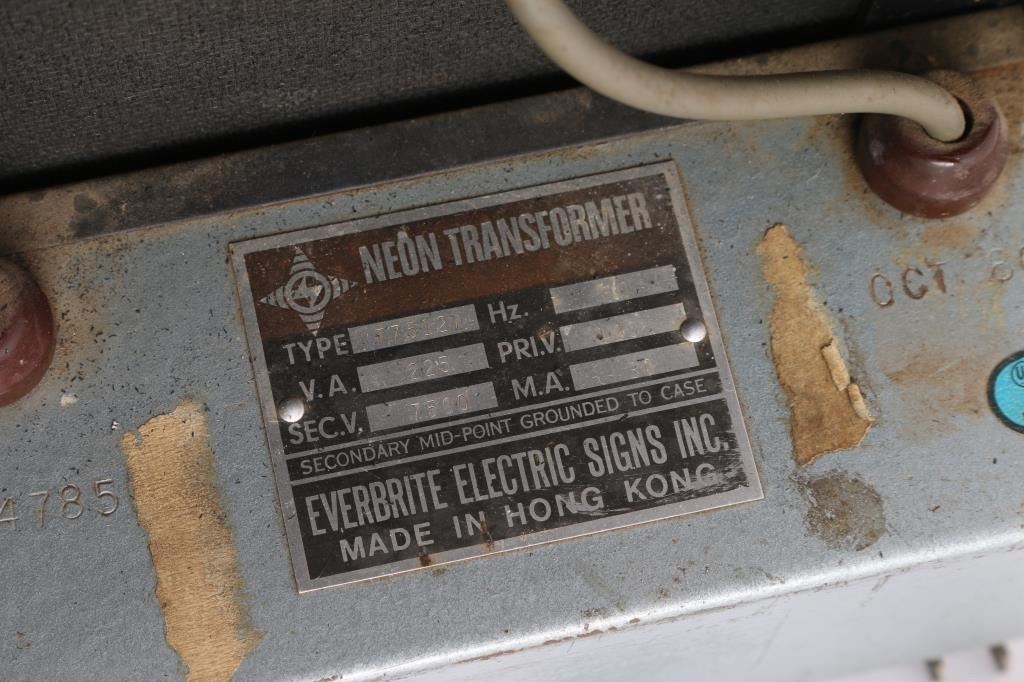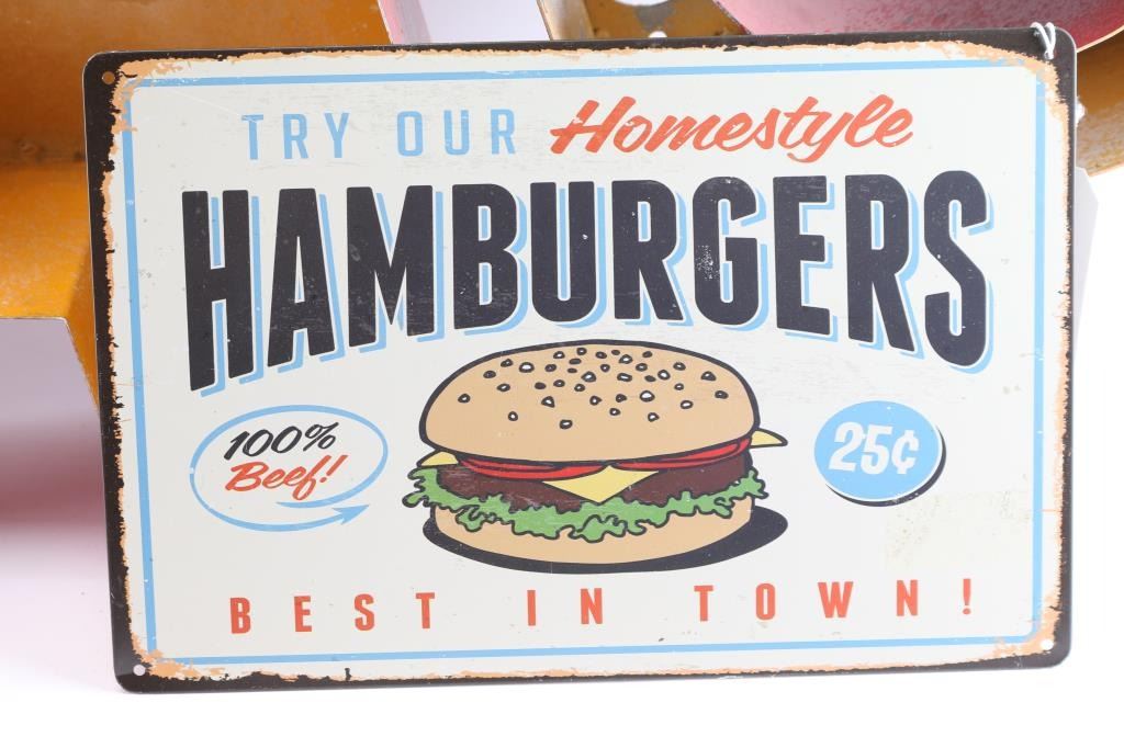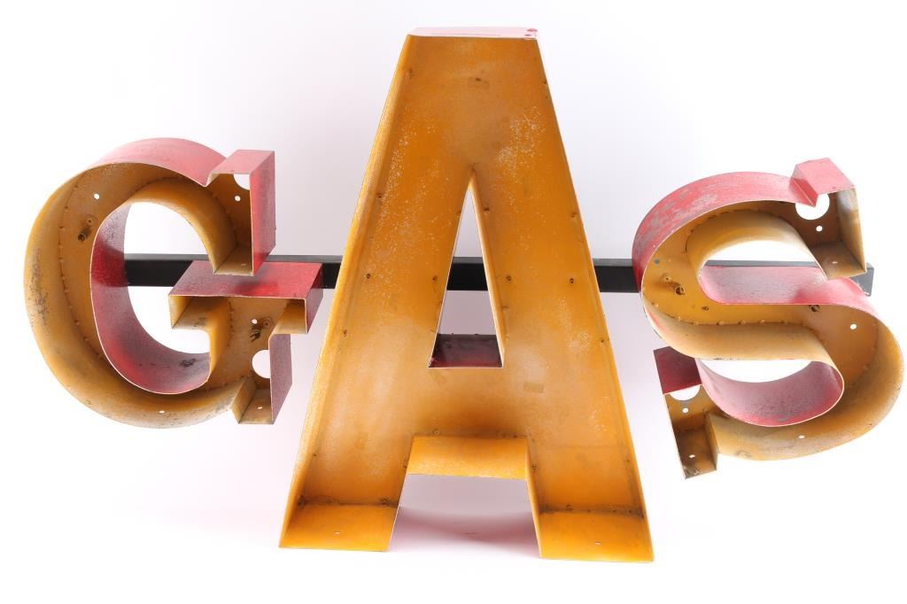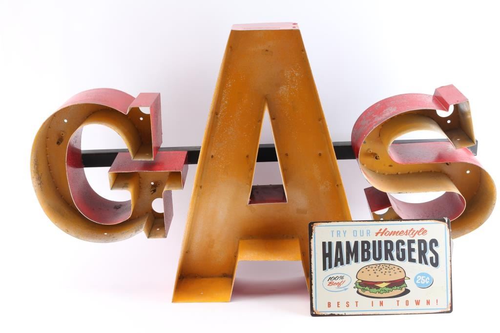 Includes: a traditional glass neon sign from the Vortex Harbin Hotel. measures 24"H X 19"W X 8"D, in good working condition; a tin 3D "GAS" sign, measures 39"L X 23"H X 6"D; and a tin "homestyle hambugers" sign measures: 12" X 8".
