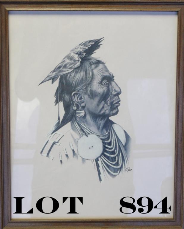 Decorative framed print of Indian Chief by M. Yellis, approx. 22” X 18” in overall good condition; nice decorator. Est.: $25-$50.