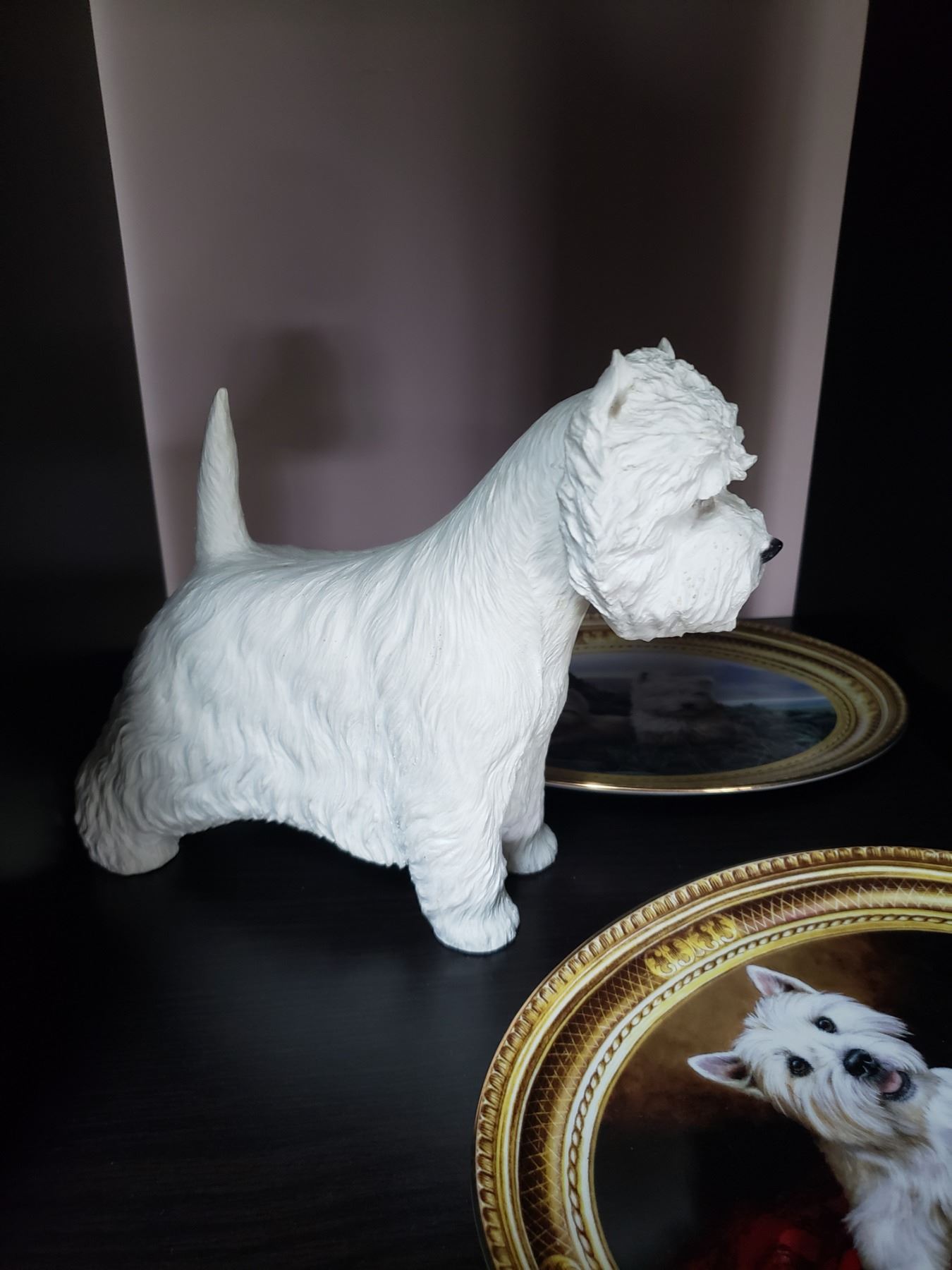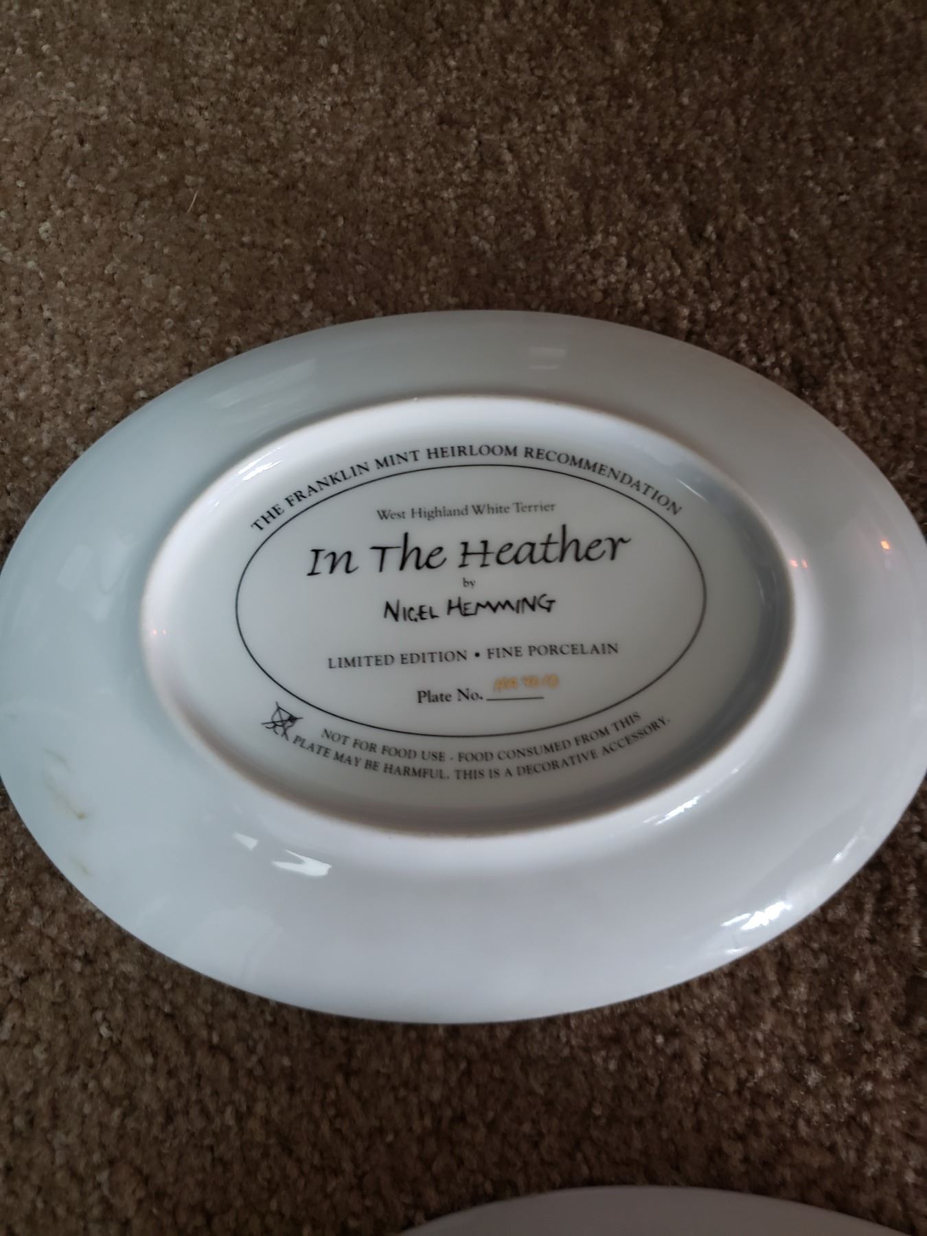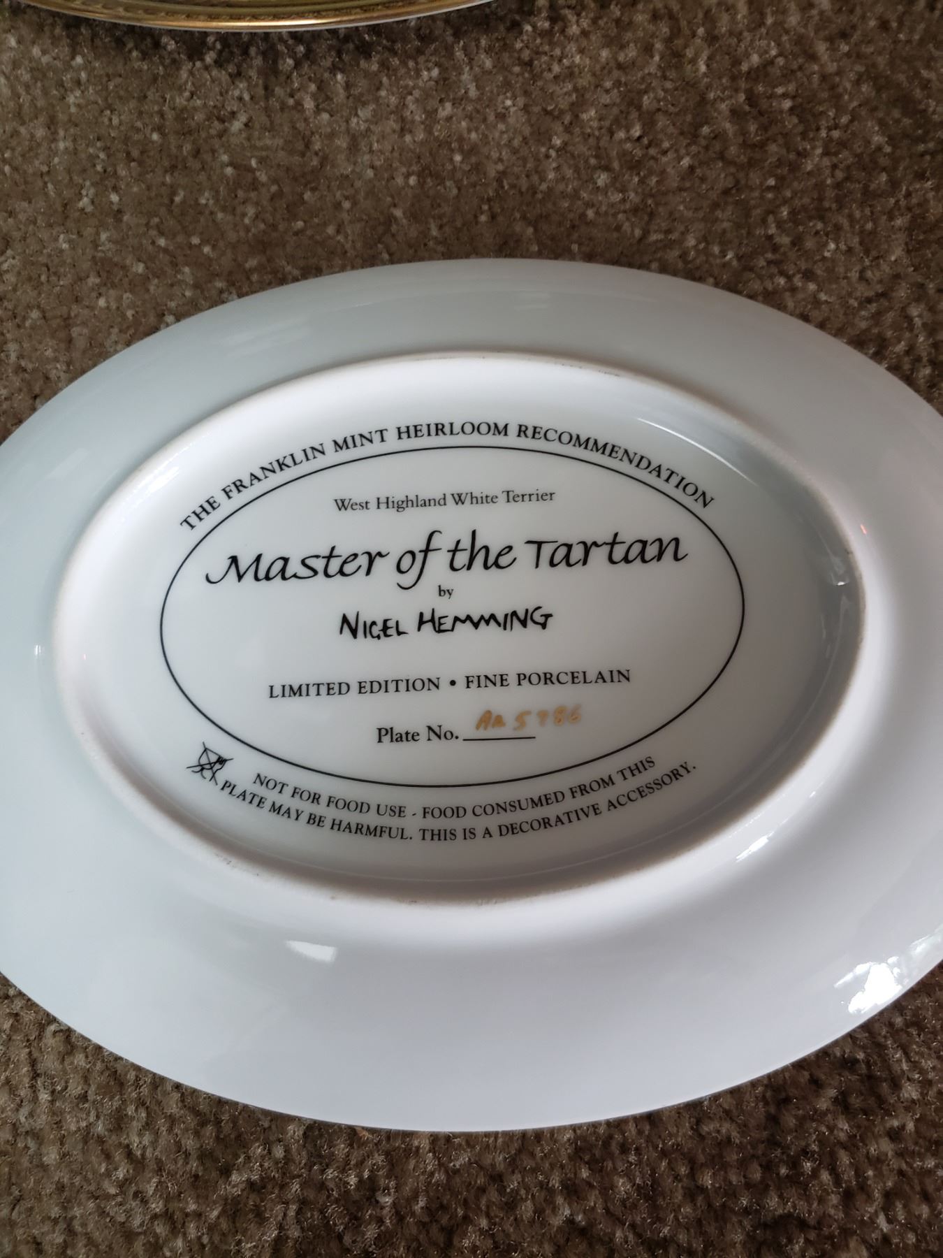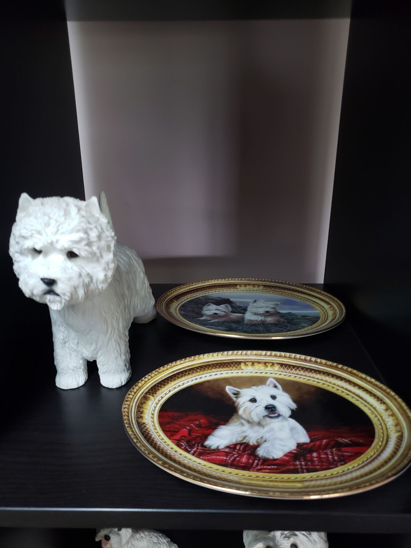 Ornamental Scottie dog(7”h) w/ 2 numbered collectors plates. Bring packing materials. Pickup between 9 to 10am