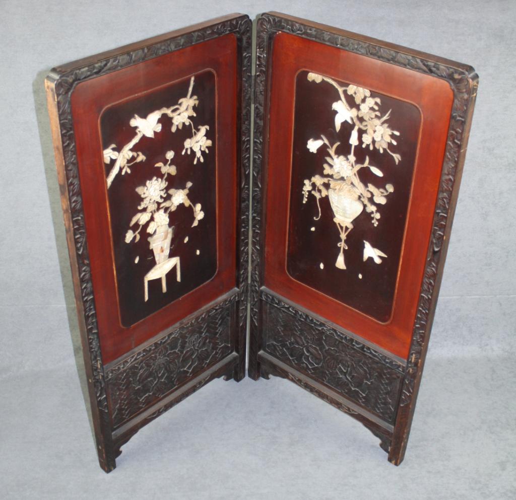 Decorative older Japanese wood screen,  approx. 36” in height and approx. 34” in  width that is hinged and can be folded in  half; overall good condition for its age and  with beautifully accomplished raised stoneand other material panels of floral and bird  scenes.  Est.:  $100-$200.