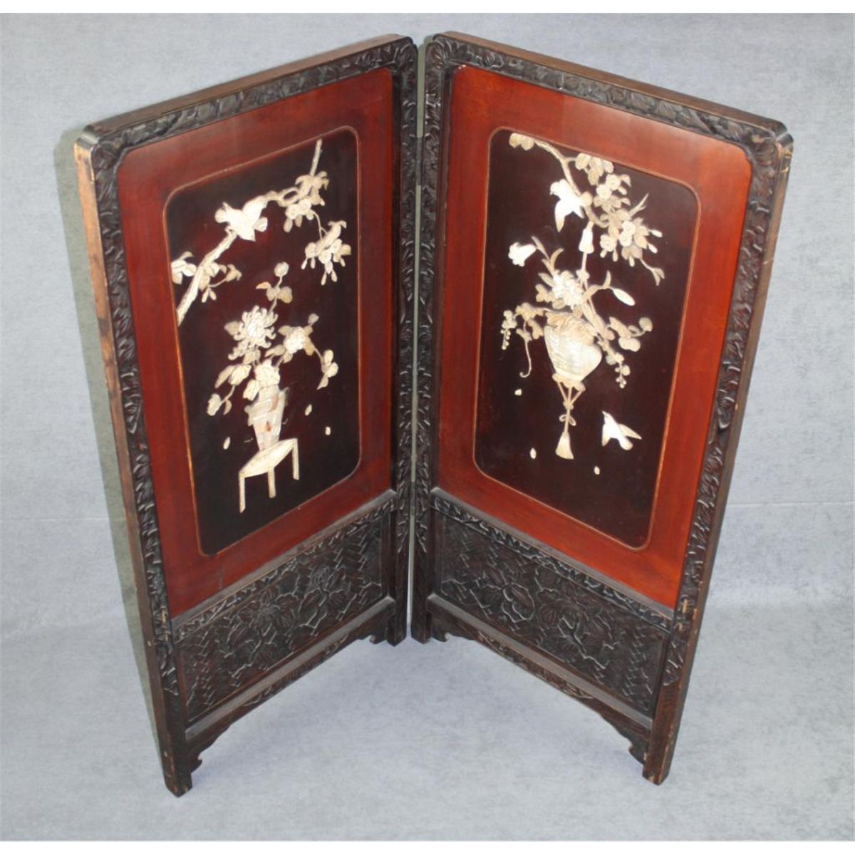 Decorative older Japanese wood screen, approx. 36” in height and approx. 34” in width that is hinged and can be folded in half; overall good condition for its age and with beautifully accomplished raised stoneand other material panels of floral and bird scenes. Est.: $350-$700.