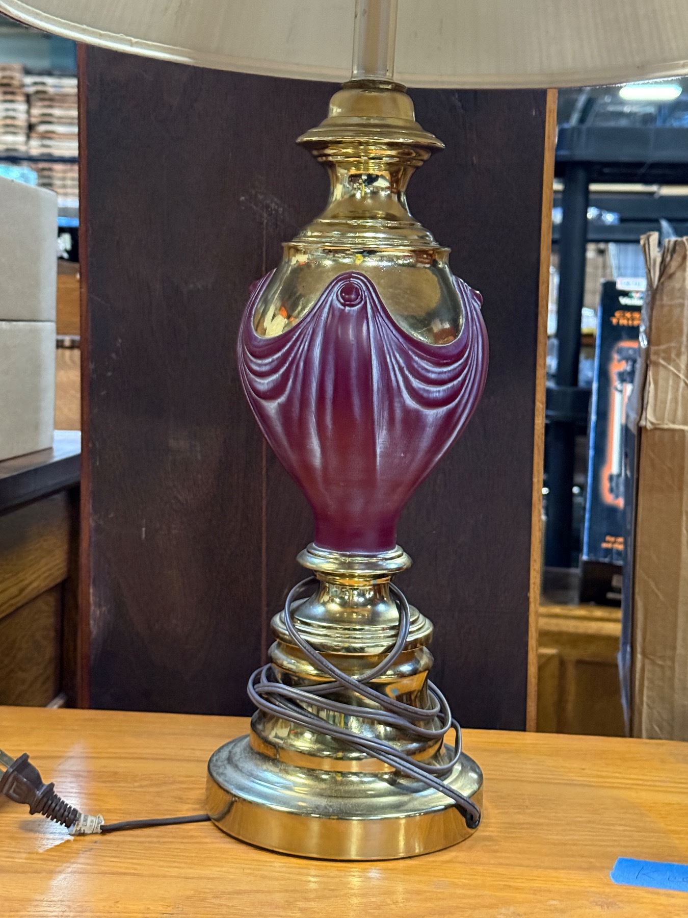 Decorative table lamp w/ brass & maroon glass base w/ pleated shade - approx 28" H