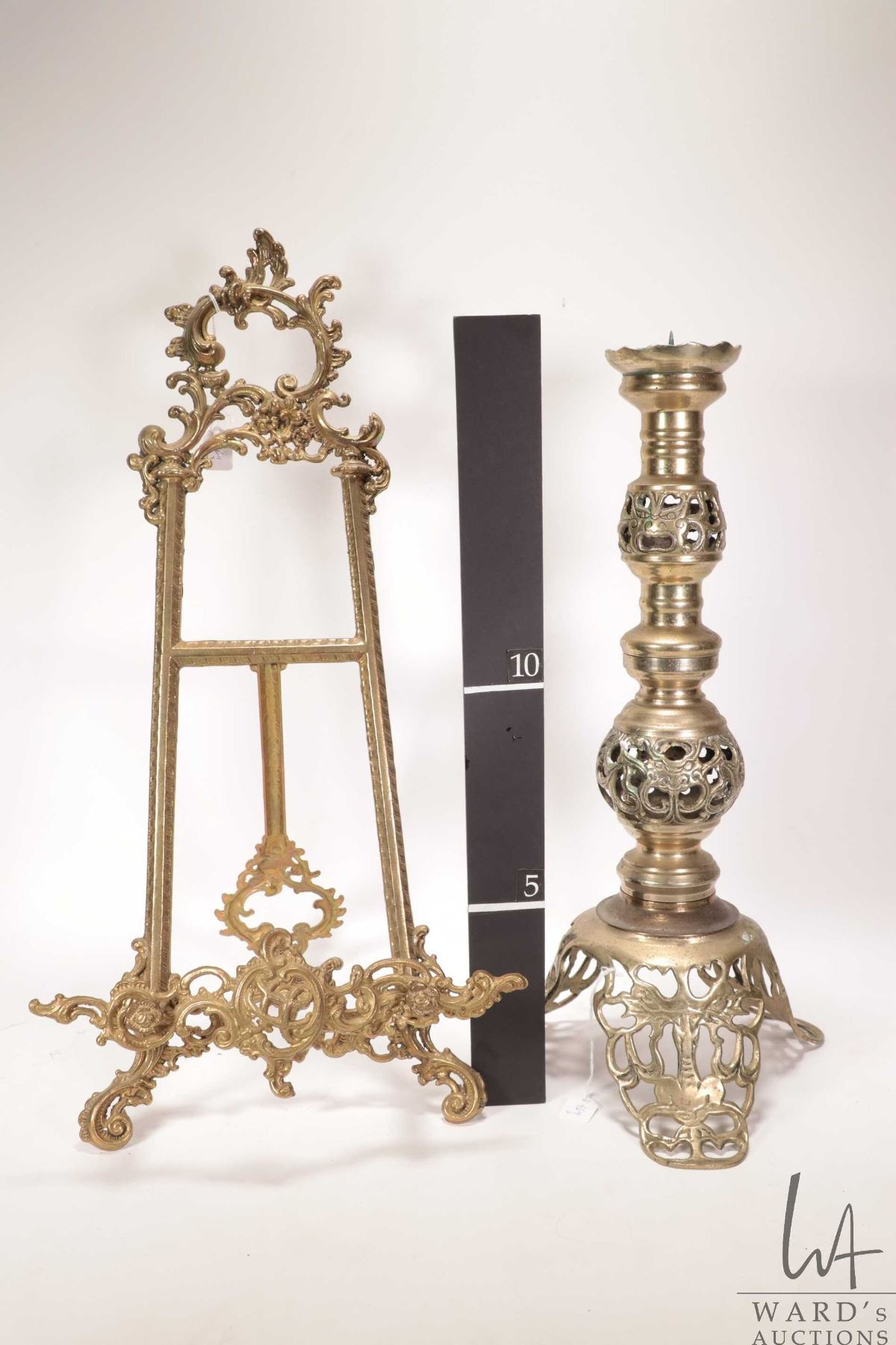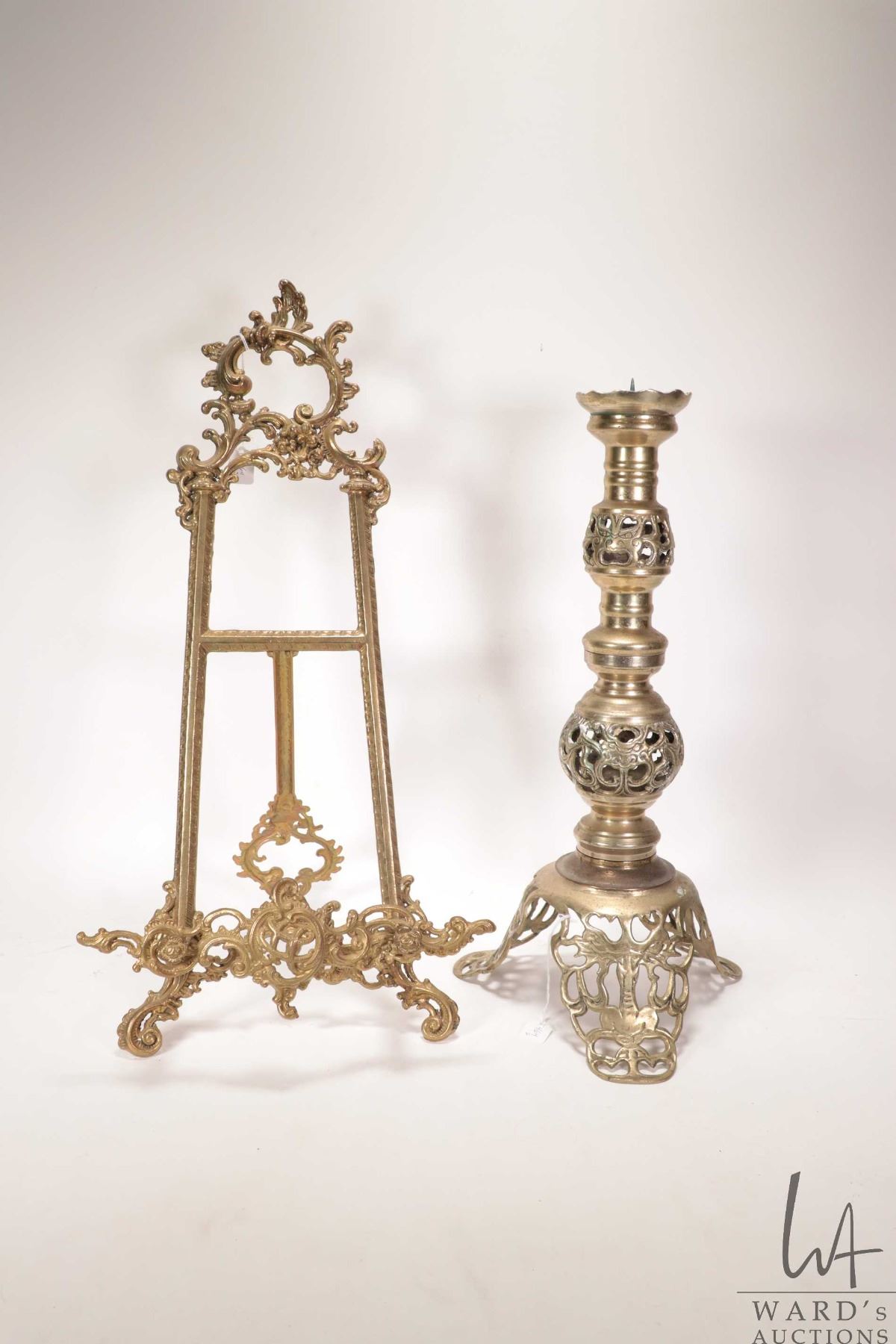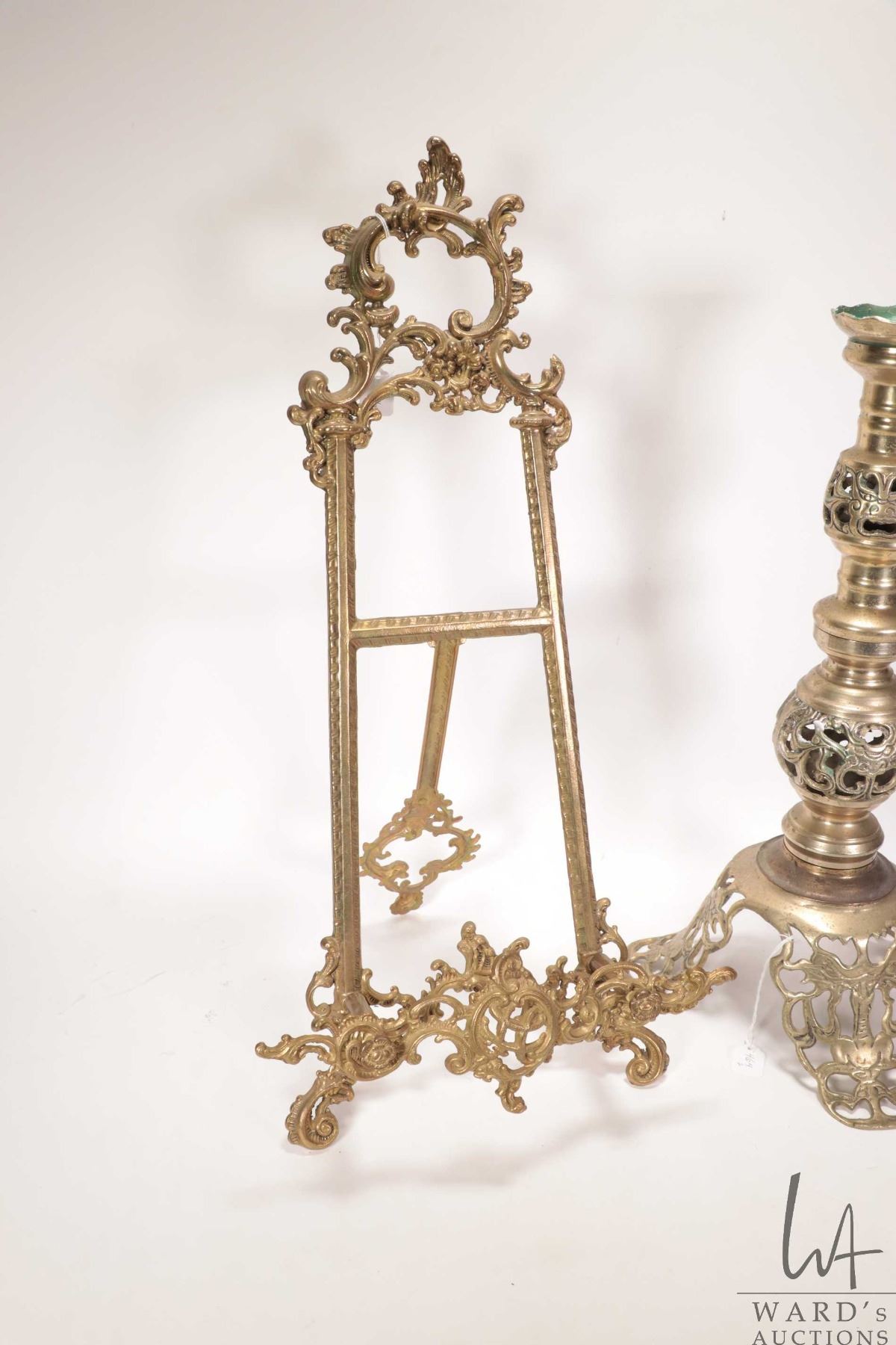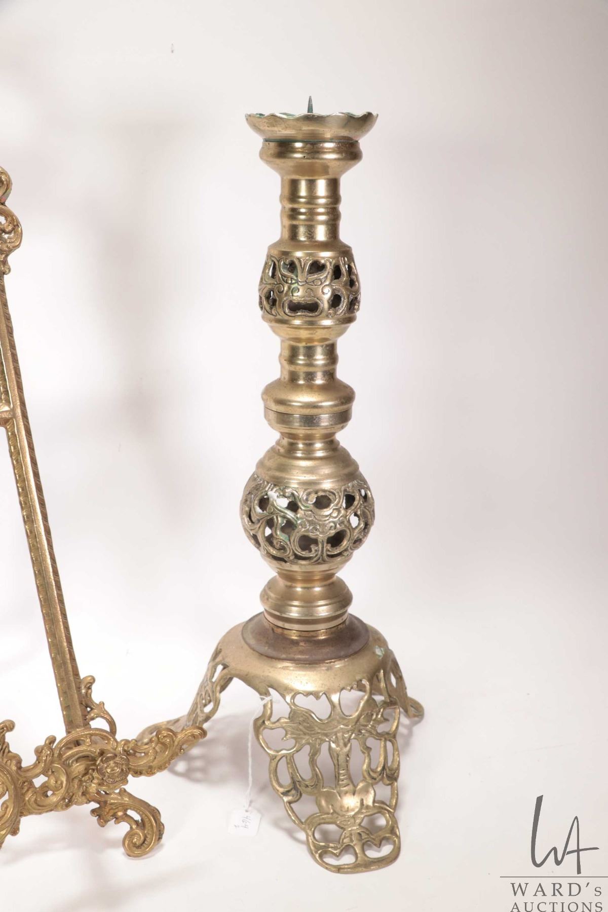 Decorative table top brass easel 21" in height and a pierce brass candlestick