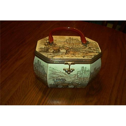 Beautiful, wooden, boxed purse, with decoupage outside displaying several pictures (brown and greys, along with white background), Stagecoach with four white horses and several passengers going across a rock bridge. Displays castles, homes, rocks, etc. Gold tone hinges and latch. Bakelite Handle. Brown leather on the inside. Stands on four tiny feet. Measures 5 3/4 inches tall; 9 inches long by 6 1/4 inches wide; Bottom diameter measures 8 3/4 inches long by 6 inches wide. Inside depth measures 4 inches; Excellent condition.