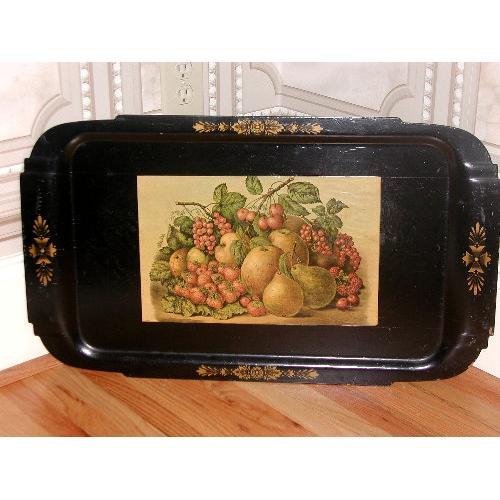 Wooden fruit tray has a center feature of aged decoupaged fruit consisting of ripe yellow and green pears,apples,red strawberriers,cherries and grapes. Gilt hand painted ornate design accents on all four sides. Large size of the tray makes an excellent serving tray or display. In excellent condition from the 1920's. Measures 26.5L X 15.5W.