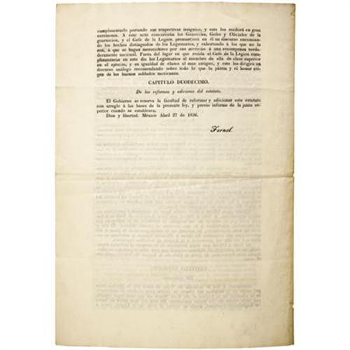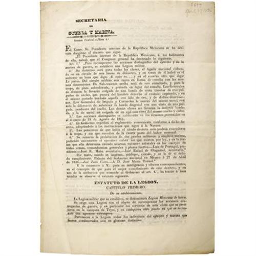 <B>Jose Maria Tornel: Secretaria de Guerra y Marina: Decree Establishing a Military Legion of Honor</B></I> <B>for honoring distinguished actions in the campaign against Texans</B></I>. (Mexico: April 27, 1836). Eight folio pages; 11.75" x 8.25". Housed in a quarter morocco four-fold case, lettered in gilt on the spine. <I>From the collection of Darrel Brown.</B></I><BR><BR><B>Reference:</B></I> Streeter 877 (see also Streeter 957). From the Eberstadt Collection, 162:490.<BR><BR><b>Shipping:</b> Books & Catalogs (<a target="_blank" href="http://www.heritageauctions.com/common/shipping.php">view shipping information</a>)