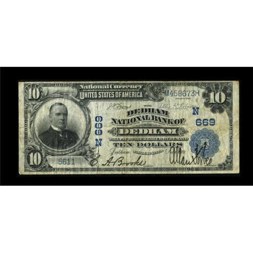 <B>Dedham, MA</B></I> - $10 1902 Plain Back Fr. 624 <B>The Dedham NB</B></I> Ch. # (N)669<BR> Beautifully original with bold printed signatures. Our records indicate only one Series 1902 note has ever been offered at public auction. <B>Very Fine.</B></I><BR><BR><b>Shipping:</b> Coins & Currency (<a target="_blank" href="http://www.heritageauctions.com/common/shipping.php">view shipping information</a>)