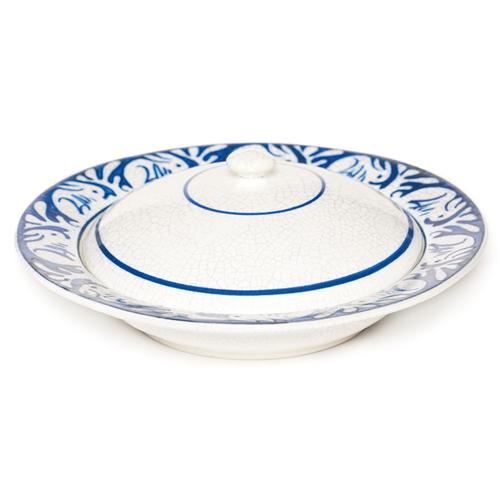 Dedham covered dish, gray crackle glaze with painted rabbit design in blue, marked, 9"w, minor flakes to base