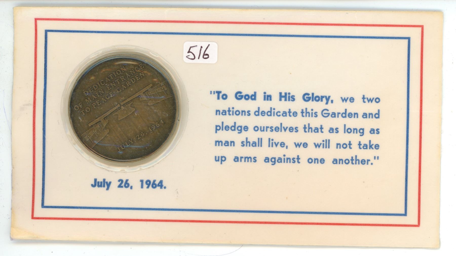 "Dedication of Main entrance of Peace garden" July 26, 1964 commemorative medallion