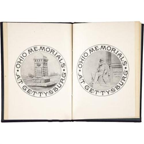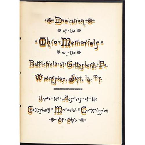 <B>[Gettysburg]. Dedication of the Ohio Memorials on the Battlefield at Gettysburg, Pa. Wednesday, Sept. 14, '87 - "Ohio Honors Her Sons".</B></I> Produced under the auspices of the Gettysburg Memorial Commission of Ohio. Printed by Nitschke Brothers Press, Columbus, Ohio. Circa 1887. Octavo. 14 pages. Facing plates with Ohio Memorials vignettes. <BR><BR>Program format with stiff wraps inserted into a blue cloth string-tie album. Interesting (and odd) two-color ink titles on dedication page. Original front cover slightly soiled, else fine. <BR><BR>The program includes a page listing the members of the Ohio memorial commission, order of exercises, a roster of Ohio corps and regiments present at the battle, battle strengths and losses, location of the memorials and a list of the memorial committees by regiment.<BR><BR><BR><b>Shipping:</b> Books & Catalogs (<a target="_blank" href="http://www.heritageauctions.com/common/shipping.php">view shipping information</a>)