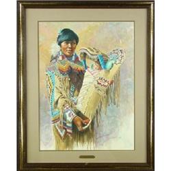 Dee Altimirano, Watercolor, "Beauty in Buckskin and Beads," 28.5" x 20", signed lower right, Est $2,000 - $3,000