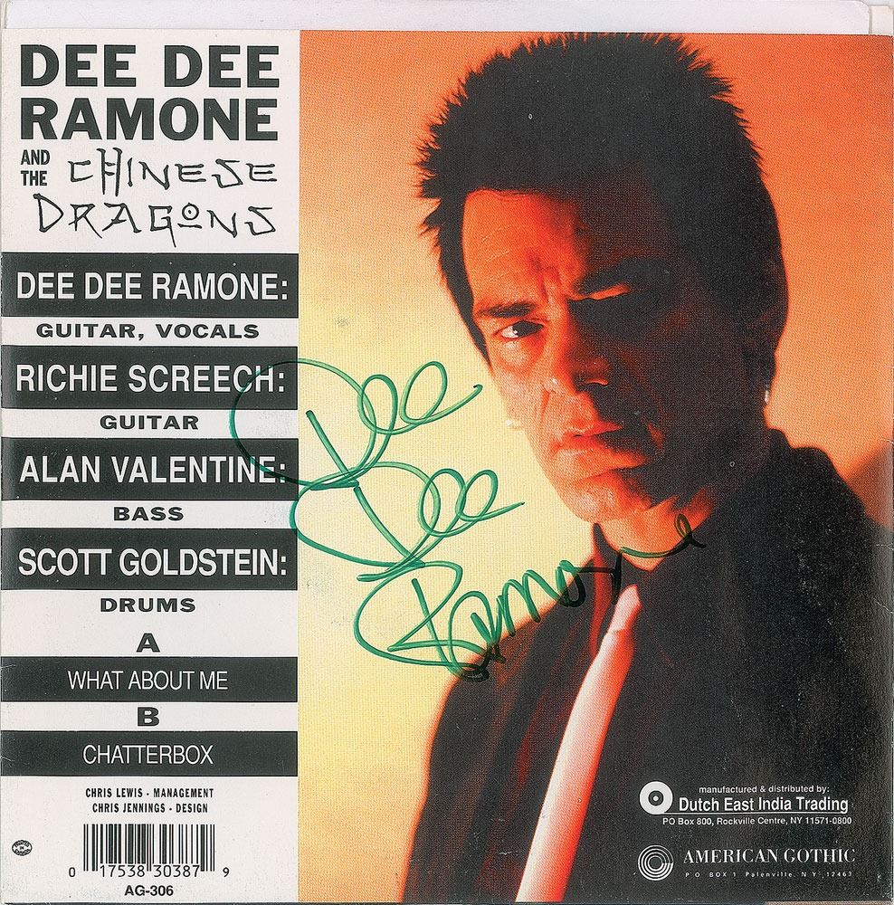 American Gothic 45 RPM single record for 'What About Me / Chatterbox' by Dee Dee Ramone and the Chinese Dragons on red vinyl, signed on the back of the sleeve in green felt tip, "Dee Dee Ramone." In fine condition. The record is included.