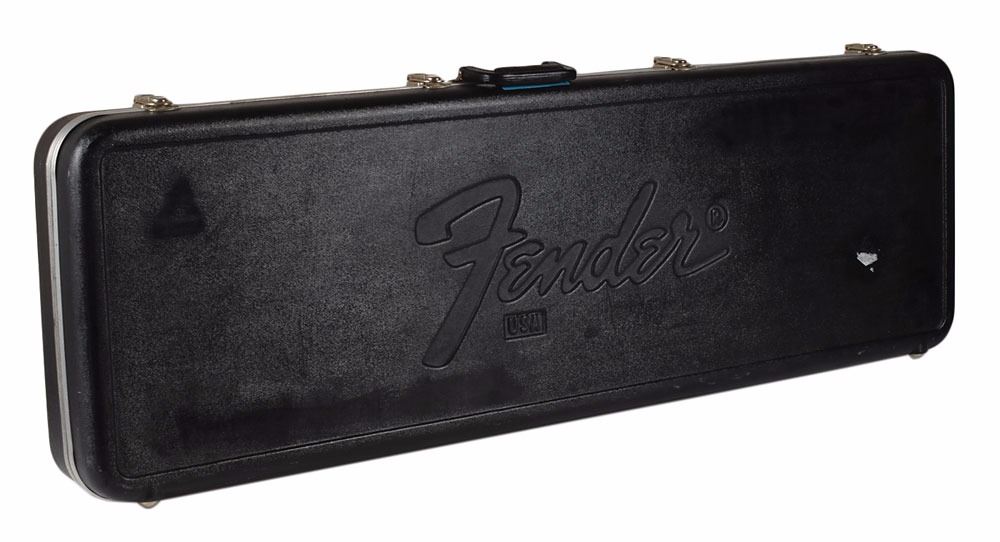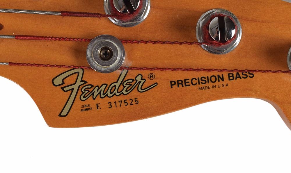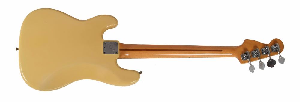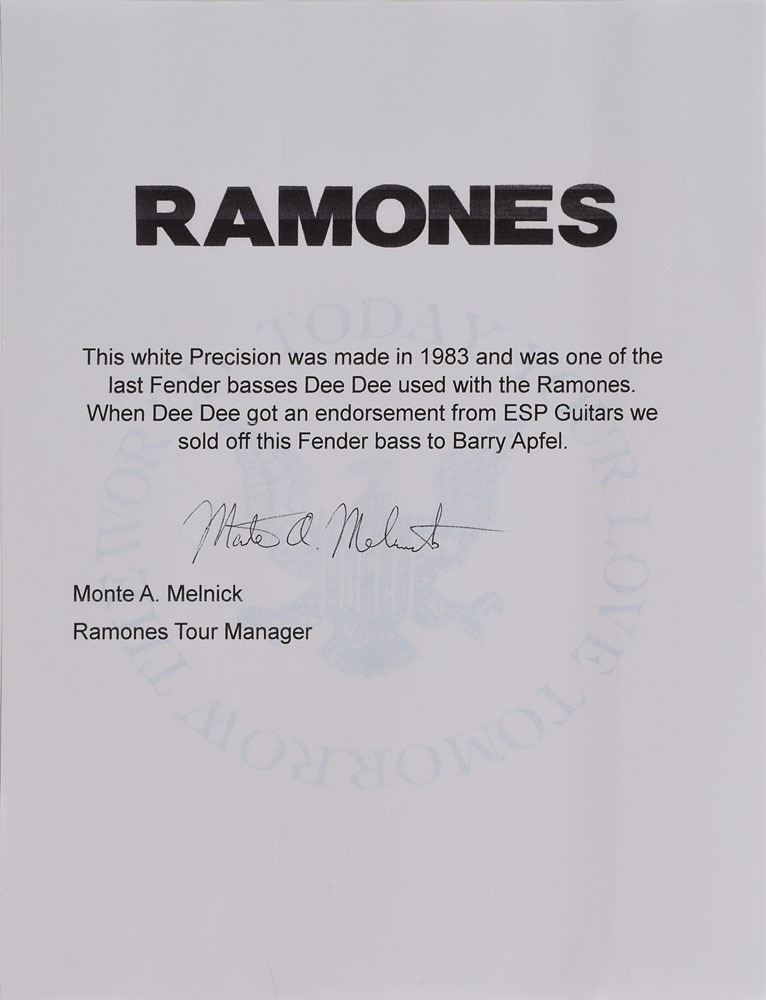 Dee Dee Ramone’s personally-owned and stage-used cream-colored Fender Precision Bass, serial number E317525 (1982–1985), purchased by Dee Dee shortly after the band's equipment was stolen in April 1983. In fine condition, with expected wear from use, including a few chips to body. Complete with an off-white “Ramones” guitar pick, an extra bass string, and a hardshell Fender carrying case, which bears a blue "Ramones" label near the handle. Accompanied by a letter of provenance from Monte Melnick, the longtime tour manager of the Ramones, in full: “This white Precision was made in 1983 and was one of the last Fender basses Dee Dee used with the Ramones. When Dee Dee got an endorsement from ESP Guitars we sold off this Fender bass to Barry Apfel.”